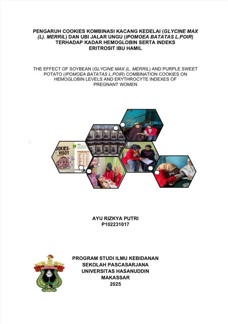 AYU RIZKYA PUTRI, Pengaruh Cookies Kombinasi Kacang Kedelai dan Ubi Jalar Ungu Terhadap Kadar Hemoglobin serta Indeks Eritrosit Ibu Hamil (Dibimbing oleh Elizabet Catherine Jusuf, Veni Hadju) Latar Belakang: Anemia defisiensi besi masih menjadi masalah gizi utama di kalangan ibu hamil, terutama di negara-negara berpenghasilan rendah dan menengah seperti Indonesia. Pemberian intervensi makanan tambahan yang kaya zat besi dan nutrien pendukung hematopoiesis menjadi salah satu upaya yang efektif untuk meningkatkan kadar hemoglobin. Kombinasi kacang kedelai (Glycine max (L.) Merrill) dan ubi jalar ungu (Ipomoea batatas L. Poir) mengandung zat besi, protein, vitamin C, dan antioksidan yang berpotensi meningkatkan kadar hemoglobin serta indeks eritrosit. Tujuan: Penelitian ini mengkaji pengaruh cookies kombinasi kedelai dan ubi jalar ungu terhadap kadar hemoglobin dan indeks eritrosit. Metode: Penelitian ini merupakan penelitian eksperimen semu dengan rancangan pre-post test control group design di Puskesmas Antara dan Puskesmas Kassi-Kassi, Makassar. Sebanyak 60 ibu hamil dibagi menjadi kelompok Intervensi (cookies + Fe, n=30) dan kelompok Kontrol (Fe, n=30), teknik pengambilan sampel menggunakan Purposive Sampling berdasarkan kriteria inklusi dan eksklusi. Hasil: Penelitian ini melibatkan ibu hamil usia 20–35 tahun dengan status gizi normal dan pendidikan >9 tahun. Terdapat peningkatan yang signifikan pada kadar hemoglobin dan indeks eritrosit (MCV, MCH, MCHC) setelah intervensi pada kelompok yang mengonsumsi cookies kombinasi kacang kedelai dan ubi jalar ungu dibandingkan dengan kelompok kontrol (p<0,05). Pada hasil analisis pretest menunjukkan nilai p > 0.05, sedangkan pada analisis posttest, kadar haemoglobin, MCV, dan MCH menunjukkan nilai p < 0.05. Sementara itu, nilai p untuk MCHC tetap > 0.05. Kesimpulan: Kukis Vi-Soy efektif dalam meningkatkan kadar hemoglobin dan memperbaiki indeks eritrosit pada ibu hamil. Intervensi ini dapat dijadikan untuk melengkapi suplementasi zat besi dalam program kesehatan ibu dan mengurangi beban anemia selama kehamilan. Kata kunci: Kacang kedelai, Ubi jalar ungu, Hemoglobin, Indeks eritrosit, Ibu hamil.