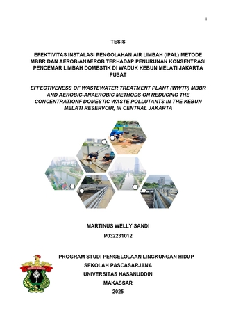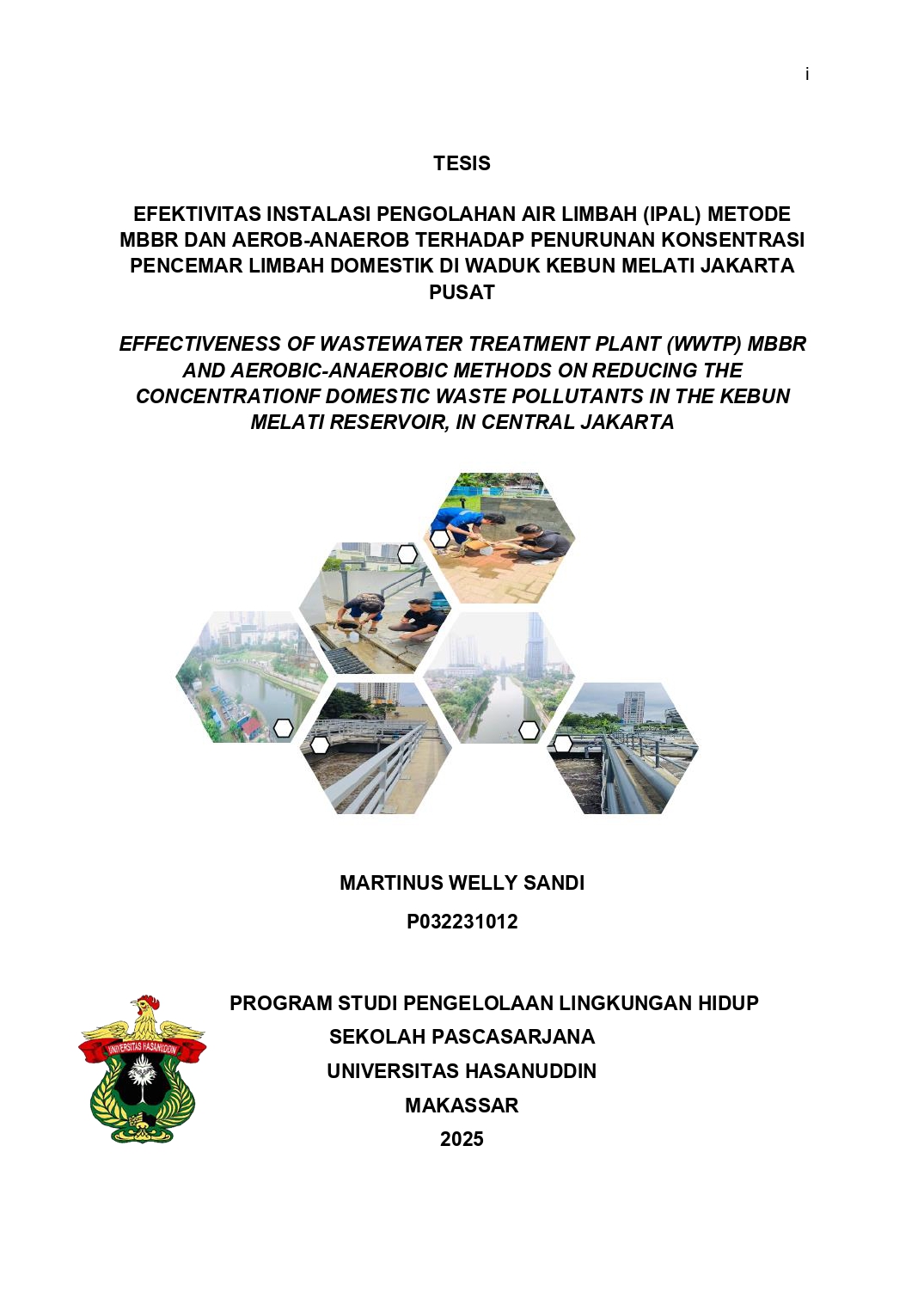 SANDI, MARTINUS WELLY (2025) EFEKTIVITAS INSTALASI PENGOLAHAN AIR LIMBAH (IPAL) METODE MBBR DAN AEROB-ANAEROB TERHADAP PENURUNAN KONSENTRASI PENCEMAR LIMBAH DOMESTIK DI WADUK KEBUN MELATI JAKARTA PUSAT = EFFECTIVENESS OF WASTEWATER TREATMENT PLANT (WWTP) MBBR AND AEROBIC-ANAEROBIC METHODS ON REDUCING THE CONCENTRATIONF DOMESTIC WASTE POLLUTANTS IN THE KEBUN MELATI RESERVOIR, IN CENTRAL JAKARTA. Skripsi thesis, Universitas Hasanuddin.