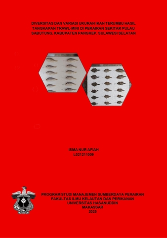 AFIAH, ISMA NUR (2025) DIVERSITAS DAN VARIASI UKURAN IKAN TERUMBU HASIL TANGKAPAN TRAWL-MINI DI PERAIRAN SEKITAR PULAU SABUTUNG, KABUPATEN PANGKEP, SULAWESI SELATAN = DIVERSITY AND SIZE VARIATION OF REEF FISH RESULTS FROM MINI-TRAWL CATCHES IN THE WATERS AROUND SABUTUNG ISLAND, PANGKEP DISTRICT, SOUTH SULAWESI. Skripsi thesis, Universitas Hasanuddin.