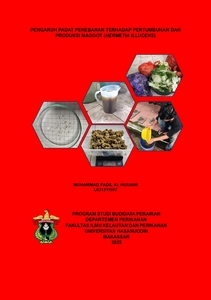 MUHAMMAD FADIL AL HUSAINI. “Pengaruh Padat Penebaran Terhadap Pertumbuhan Dan Produksi Maggot (Hermetia Illucens)” (Ir. Irfan Ambas, M.Sc., Ph. D) Latar belakang. Maggot merupakan salah satu jenis pakan alami yang memiliki kandungan protein yang cukup tinggi. Maggot memiliki kemampuan mengurai sampah organik yang ramah lingkungan sehingga maggot banyak diminati untuk dibudidayakan oleh Masyarakat baik untuk pemanfaatan secara pribadi maupun untuk komersialisasi. Salah satu faktor yang berpengaruh terhadap pertumbuhan dan produksi pada budidaya adalah padat penebaran. Padat tebar yang tepat yaitu kepadatan yang mampu menghasil pertumbuhan dan produksi maggot yang optimal.Penelitian ini mengevaluasi beberapa padat penebaran awal larva maggot untuk mendapatkan gambaran laju pertumbuhan dan produksi terbaik. Metode. Penelitian ini dilakukan pada bulan Februari 2025 sampai Maret 2025 di Unit Hatchery Fakultas Ilmu Kelautan dan Perikanan Universitas Hasanuddin. Hewan uji yang digunakan adalah bibit maggot yang berumur 5 hari setelah menetas, berukuran 0,78 mg/ekor. Penelitian ini menggunakan rancangan acak lengkap (RAL) yang terdiri dari 4 perlakuan padat tebar dengan masing-masing terdiri dari 3 ulangan. Perlakuan yang diuji yaitu padat penebaran larva 1 individu/cm2 (A); 2 individu/cm2 (B), 3 individu/cm2 (C) dan 4 individu/cm2. (D). Hasil. Data hasil penelitian yang dianalisis menggunakan uji One Way ANOVA, menunjukkan bahwa padat penebaran berpengaruh sangat nyata (P<0,01) terhadap pertumbuhan dan poduksi maggot. Selanjutnya hasil uji lanjut W tuckey menunjukkan bahwa, pertumbuhan mutlak (g) secara nyata (P<0.05) didapatkan lebih tinggi pada padat tebar 4 individu/cm2 (142,26 ± 6.37 g) dan produksi sebesar 0,4954 ± 0,022 g/cm2 . Pertumbuhan berat mutlak terendah (31,08 ± 1,87 g) diperoleh pada padat tebar 1 individu/cm2 dengan produksi terendah hanya 0,1083 ± 0,006d g/cm2. Kesimpulan. Berdasarkan hasil penelitian bahwa untuk mendapatkan pertumbuhan mutlak dan produksi maggot yang terbaik, pada pemeliharaan maggot digunakan padat tebar 4 individu/cm2.