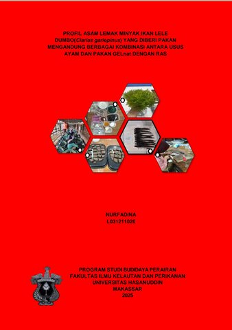 NURFADINA, NURFADINA (2025) Profil Asam Lemak Minyak Ikan Lele dumbo (Clarias gariepinus) Yang Diberi Pakan Mengandung Berbagai Kombinasi Antara Usus Ayam dan Pakan GELnat dengan RAS = Fatty acid profile of catfish oil (clarias gariepinus) fed with various combination of chicken intestines and GELnat feed with RAS. Skripsi thesis, Universitas Hasanuddin.