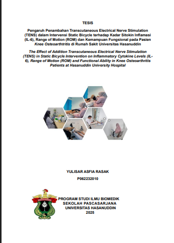 YULISAR ASFIA RASAK. Pengaruh Penambahan Transcutaneous Electrical Nerve Stimulation (TENS) dalam Intervensi Static Bicycle terhadap Kadar Sitokin Inflamasi (IL-6), Range of Motion (ROM), dan Kemampuan Fungsional pada Pasien Knee Osteoarthritis di Rumah Sakit Universitas Hasanuddin. (Dibimbing oleh Andi Ariyandy dan M. Aryadi Arsyad). Latar Belakang. Osteoarthritis lutut (KOA) merupakan penyakit degeneratif yang ditandai dengan nyeri, keterbatasan gerak, dan penurunan kemampuan fungsional. Peningkatan kadar sitokin inflamasi seperti Interleukin-6 (IL-6) berperan dalam progresi penyakit ini. Intervensi fisik seperti static bicycle diketahui membantu meningkatkan mobilitas sendi dan mengurangi inflamasi, sementara TENS efektif mengurangi nyeri. Namun, studi mengenai kombinasi keduanya masih terbatas. Tujuan. Menilai pengaruh penambahan TENS pada intervensi static bicycle terhadap kadar IL-6, ROM, dan kemampuan fungsional pasien KOA. Metode. Penelitian ini merupakan studi quasi-eksperimental dengan desain two-group pre-test post-test. Sebanyak 32 pasien KOA dibagi menjadi dua kelompok: Kelompok 1 menerima terapi static bicycle, dan Kelompok 2 menerima kombinasi static bicycle dan TENS. Kadar IL-6 diukur menggunakan metode ELISA, ROM diukur dengan goniometer, dan kemampuan fungsional dinilai menggunakan indeks WOMAC. Analisis statistik mencakup uji Shapiro-Wilk, paired t-test, Wilcoxon, independent t-test, dan MannWhitney dengan tingkat signifikansi p<0,05. Hasil. Hasil penelitian menunjukkan bahwa terdapat penurunan kadar IL-6 yang signifikan pada kedua kelompok, dengan kelompok kombinasi static bicycle dan TENS mengalami penurunan lebih besar (median pre-test: 11,8 pg/mL; post-test: 1,2 pg/mL; p=0,001) dibandingkan dengan kelompok static bicycle saja (mean pre-test: 11,55 ± 2,43 pg/mL; post-test: 9,83 ± 2,27 pg/mL; p=0,008). Peningkatan ROM lebih signifikan pada kelompok kombinasi (mean pre-test: 120,48±5,55°; post-test: 131,10±2,82°; p=0,001) dibandingkan dengan kelompok static bicycle saja (mean pre-test: 122,36±5,62°; post-test: 125,36±5,77°; p=0,001). Skor WOMAC juga menunjukkan perbaikan kemampuan fungsional yang lebih besar pada kelompok kombinasi (mean difference: 26,06 ; p=0,001) dibandingkan dengan kelompok static bicycle saja (mean difference: 14,12; p=0,001). Terdapat penurunan signifikan kadar IL-6 setelah intervensi pada kedua kelompok, dengan penurunan yang lebih besar pada kelompok kombinasi (median - 9.44 vs -1.50; p=0.001). Peningkatan ROM juga lebih besar pada kelompok kombinasi (10.62° vs 3.22°; p=0.001). Skor WOMAC menunjukkan perbaikan fungsional signifikan pada kedua kelompok, namun lebih besar pada kelompok kombinasi (penurunan -26.06 vs -14.13; p=0.001). Kesimpulan. Kombinasi intervensi static bicycle dan TENS lebih efektif dibandingkan static bicycle saja dalam menurunkan kadar IL-6, meningkatkan ROM, dan memperbaiki kemampuan fungsional pada pasien KOA. Terapi kombinasi ini direkomendasikan sebagai pendekatan optimal dalam penatalaksanaan KOA.