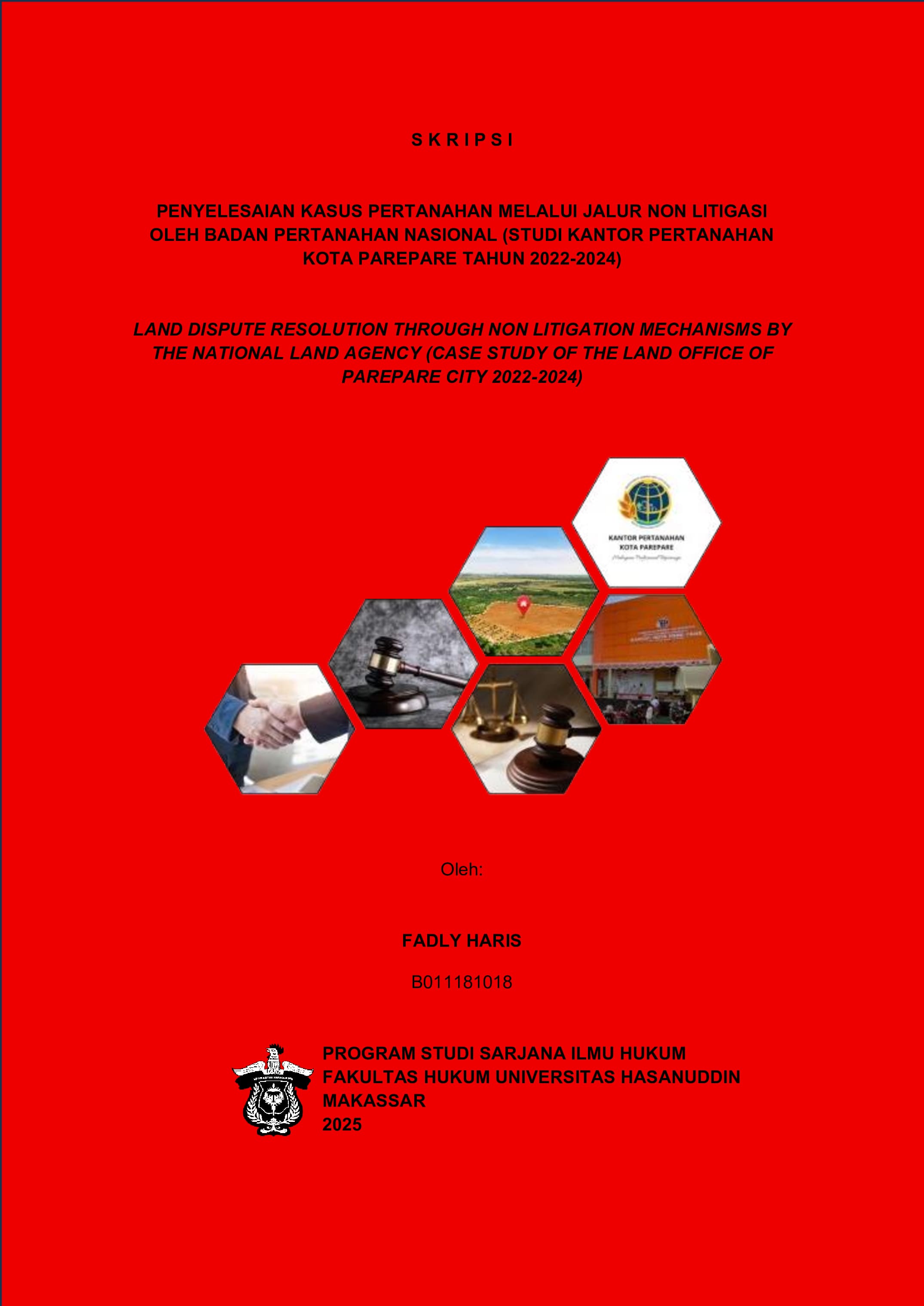 HARIS, FADLY (2025) Penyelesaian Kasus Pertanahan Melalui Jalur Non Litigasi Oleh Badan Pertanahan Nasional (Studi Kantor Pertanahan Kota Parepare Tahun 2022-2024). = Land Dispute Resolution Through Non Litigation Mechanisms By the National Land Agency (Case Study of the Land Office of Parepare City 2022-2024). Skripsi thesis, Universitas Hasanuddin.