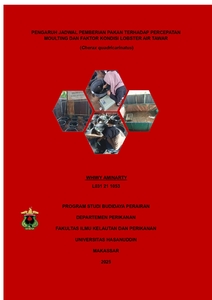 WHIWY: THE EFFECT OF FEEDING SCHEDULE ON MOULTING ACCELERATION AND CONDITION FACTORS OF FRESHWATER LOBSTER (Cherax quadricarinatus). Supervised by Main Supervisor Prof. Dr. Ir. Muhammad Yusri Karim., M.Si Background. Feed is a component in aquaculture that plays a very large role in terms of growth determinants and production costs, given that crayfish are omnivorous animals that can be fed with tubifex feed and commercial feed. In addition, nutrition and successful molting play an important role in crayfish growth. Objective. This study was to evaluate the feeding schedule of natural feed to artificial feed on moulting acceleration and condition factors. Methods. This research was conducted from December 2024 to February 2025, Maintenance was carried out for 30 days at the Bumi Paccelekang Sejahtera Freshwater Lobster Breeding Unit (BUMDES), Pacellekang Village, Pattalassang District, Gowa Regency. The stocking density of crayfish was 50 fish/container with a water volume of 15 L/container. The study was designed using the complete randomized design (CRD) method consisting of 4 treatments and each treatment had 3 replicates. The data obtained were analyzed using analysis of variance (ANOVA). If there is a significant effect, then continued with the W-Tuckey further test. As a tool for statistical tests, the SPSS program with version 29.0 was used. Results. The results showed that different feeding schedules had a very significant effect (p < 0.01) on the molting of crayfish fry. The results of the W-Tuckey further test showed that feeding schedules A and B had a significant effect on the molting of crayfish fry.
