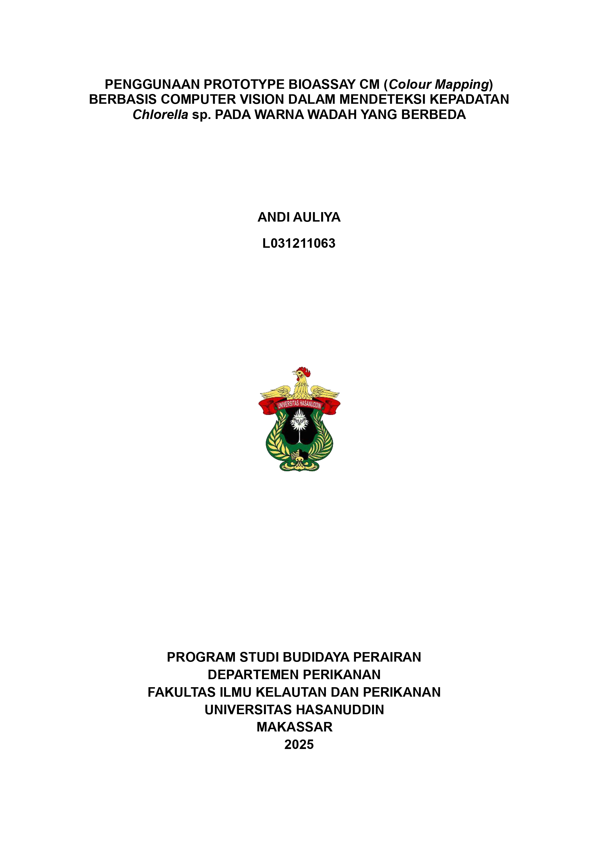 AULIYA, ANDI (2025) PENGGUNAAN PROTOTYPE BIOASSAY CM (Colour Mapping) BERBASIS COMPUTER VISION DALAM MENDETEKSI KEPADATAN Chlorella sp. PADA WARNA WADAH YANG BERBEDA = Use of Computer Vision-Based CM (Colour Mapping) Bioassay Prototype in Detecting Chlorella sp. Density in Different Container Colors. Skripsi thesis, Universitas Hasanuddin.