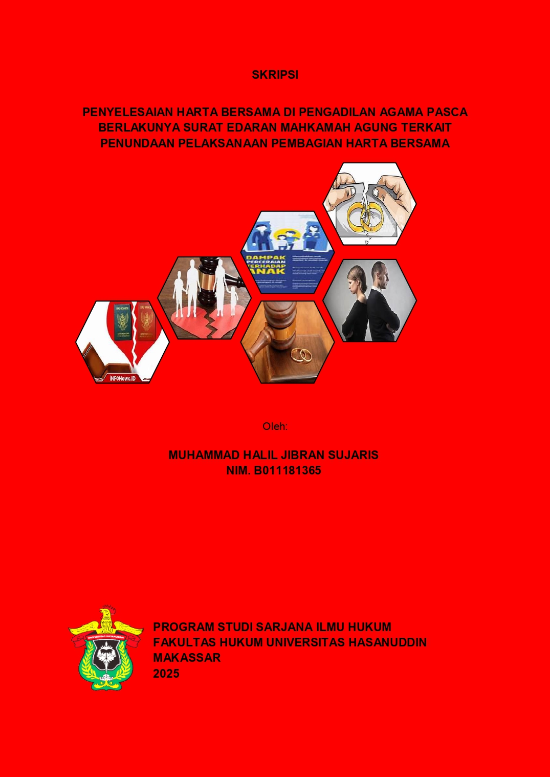 SUJARIS, MUH. HALIL JIBRAN (2025) PENYELESAIAN HARTA BERSAMA DI PENGADILAN AGAMA PASCA BERLAKUNYA SURAT EDARAN MAHKAMAH AGUNG TERKAIT PENUNDAAN PELAKSANAAN PEMBAGIAN HARTA BERSAMA = Settlement of Joint Marital Property in the Religious Court After the Enactment of the Supreme Court Circular Concerning the Postponement of the Distribution of Joint Marital Property. Skripsi thesis, Universitas Hasanuddin.