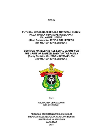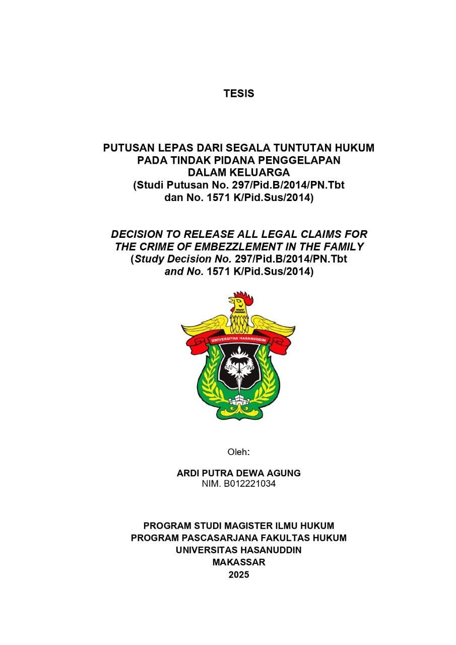 AGUNG, ARDI PUTRA DEWA (2025) PUTUSAN LEPAS DARI SEGALA TUNTUTAN HUKUM PADA TINDAK PIDANA PENGGELAPAN DALAM KELUARGA (Studi Putusan No. 297/Pid.B/2014/PN.Tbt dan No. 1571 K/Pid.Sus/2014) = DECISION TO RELEASE ALL LEGAL CLAIMS FOR THE CRIME OF EMBEZZLEMENT IN THE FAMILY (Study Decision No. 297/Pid.B/2014/PN.Tbt and No. 1571 K/Pid.Sus/2014). Thesis thesis, UNIVERSITAS HASANUDDIN.