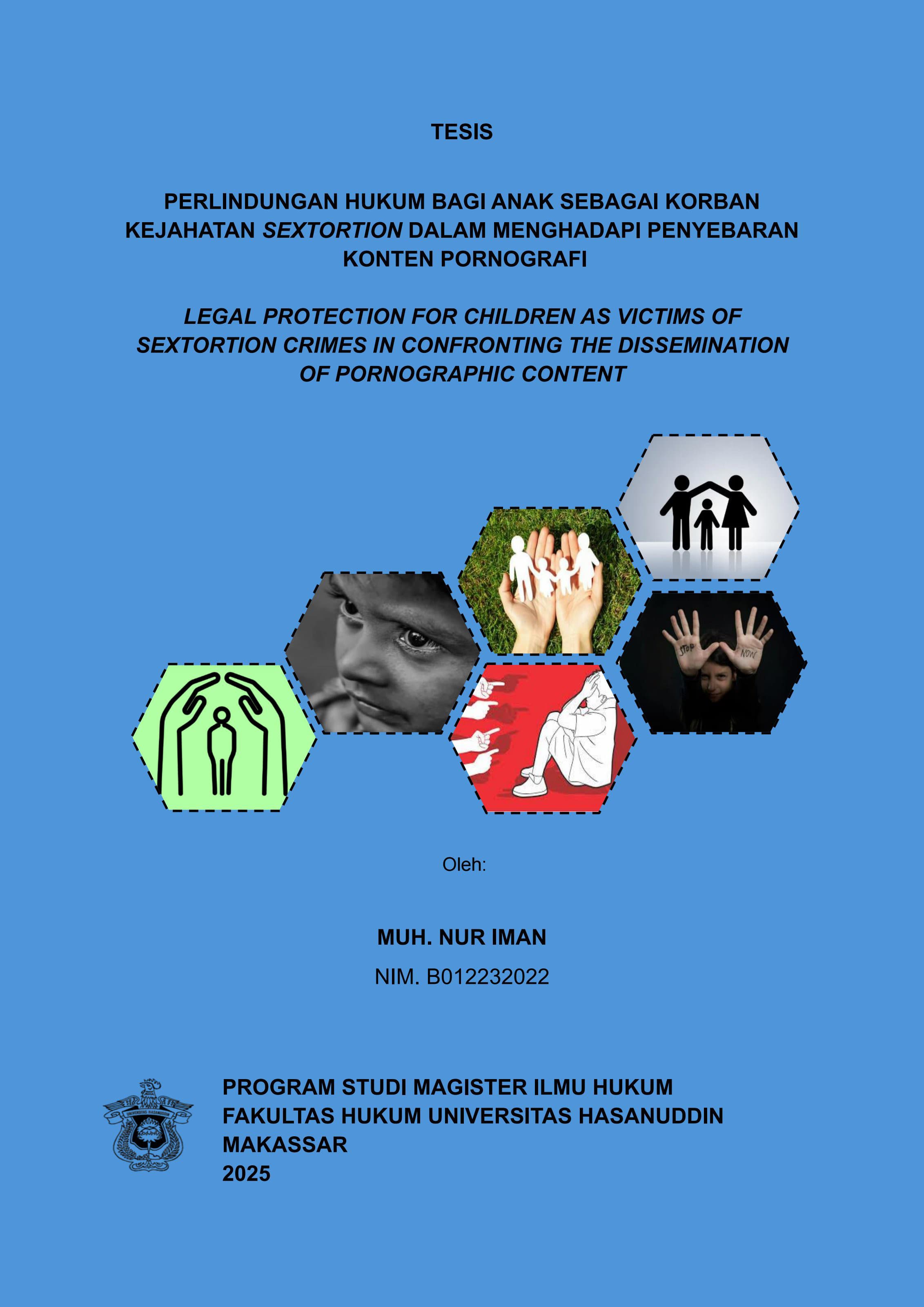 MUH. NUR IMAN (B012232022). Perlindungan Hukum Bagi Anak Sebagai Korban Kejahatan Sextortion Dalam Menghadapi Penyebaran Konten Pornografi. Dibimbing oleh Muji Iswanty sebagai Pembimbing. Latar Belakang: Hak anak untuk mendapat perlindungan dari kekerasan dan eksploitasi dijamin oleh Pasal 28B ayat (2) UUD 1945, UU Perlindungan Anak, dan UU TPKS. Namun, belum adanya regulasi khusus yang mengatur sextortion terhadap anak menyebabkan perlindungan hukum belum optimal, sehingga pemenuhan hak korban masih terhambat. Tujuan: Penelitian ini bertujuan untuk menganalisis perlindungan hukum dan mekanisme efektif dalam melindungi anak sebagai korban sextortion dari penyebaran konten pornografi dan pelanggaran privasi. Metode: Pendekatan normatif dengan bahan hukum primer berupa peraturan perundang-undangan dan bahan sekunder dari studi pustaka, yang dianalisis secara deskriptif. Hasil : Penelitian ini menunjukkan bahwa (1) Perlindungan hukum anak korban sextortion termasuk restitusi, rehabilitasi, dan kerahasiaan identitas sering tidak optimal karena kurangnya pemahaman korban, sehingga hak perlu diubah menjadi kewajiban negara demi efektivitas perlindungan. (2) Mekanisme perlindungan privasi yang efektif dimulai dari transformasi hak menjadi kewajiban dengan pendampingan, bantuan hukum cepat, ramah anak, dan koordinasi lembaga, termasuk kebijakan takedown. Kesimpulan: Hak anak korban yang terhambat proses panjang perlu diubah menjadi kewajiban negara melalui revisi aturan; perlindungan privasi korban sextortion harus diwujudkan melalui pendampingan dan bantuan hukum yang cepat, efektif, ramah anak, dan terkoordinasi.