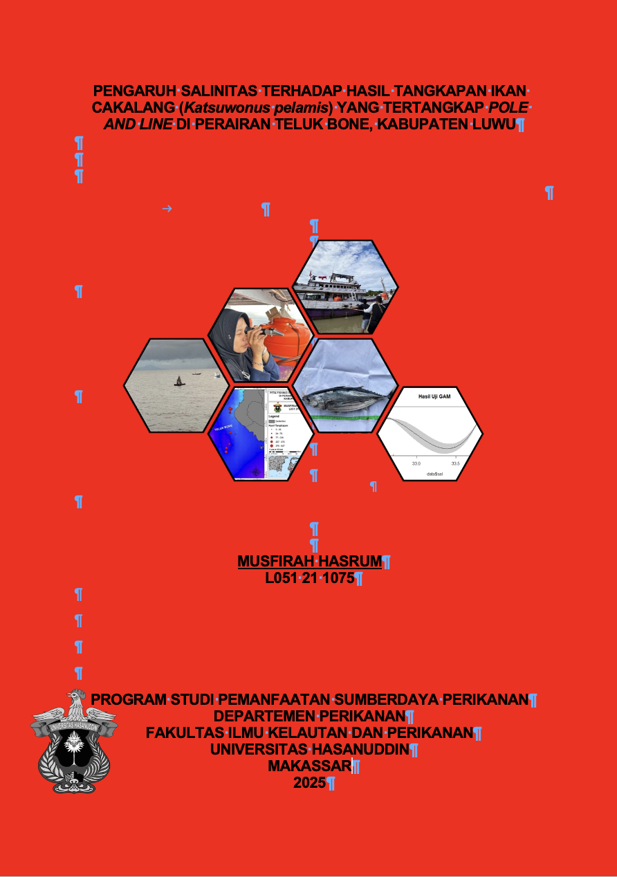 Musfirah Hasrum. L051211075. Pengaruh Salinitas Terhadap Hasil Tangkapan Ikan Cakalang (Katsuwonus pelamis) yang Tertangkap Pole and Line di Perairan Teluk Bone Kabupaten Luwu (Dibimbing oleh Prof Safruddin) Latar Belakang: Ikan cakalang (Katsuwonus pelamis) merupakan salah satu komoditas perikanan penting di Indonesia, khususnya di perairan Teluk Bone, Kabupaten Luwu. Salinitas perairan berperan penting dalam menentukan distribusi dan keberhasilan penangkapan ikan. Tujuan: Penelitian ini bertujuan untuk mengidentifikasi hubungan antara salinitas dan hasil tangkapan ikan cakalang, serta memberikan informasi yang berguna bagi nelayan dalam menentukan lokasi penangkapan yang lebih efektif. Metode: Penelitian ini menggunakan metode Generalized Additive Model (GAM) untuk menganalisis hubungan non-linear antara salinitas dan hasil tangkapan ikan cakalang. Data primer dikumpulkan melalui observasi langsung dan pengukuran salinitas di lokasi penangkapan. Analisis dilakukan dengan menggunakan perangkat lunak R, khususnya paket `mgcv`, untuk membangun model yang menggambarkan hubungan antara salinitas dan jumlah tangkapan. Hasil: Hasil penelitian menunjukkan bahwa salinitas memiliki pengaruh signifikan terhadap jumlah ikan cakalang yang ditangkap, dengan salinitas optimum berada pada kisaran 32-34 ppt. Produksi ikan cakalang bervariasi dari tahun ke tahun, dan hasil tangkapan tertinggi tercatat pada salinitas 33,5-34 ppt. Model GAM berhasil menangkap hubungan non-linear antara salinitas dan hasil tangkapan. Kesimpulan: Salinitas merupakan faktor kunci dalam menentukan habitat dan keberhasilan penangkapan ikan cakalang. Penelitian ini diharapkan dapat mendukung pengelolaan perikanan yang berkelanjutan dan memberikan panduan bagi nelayan dalam menentukan lokasi penangkapan yang optimal.