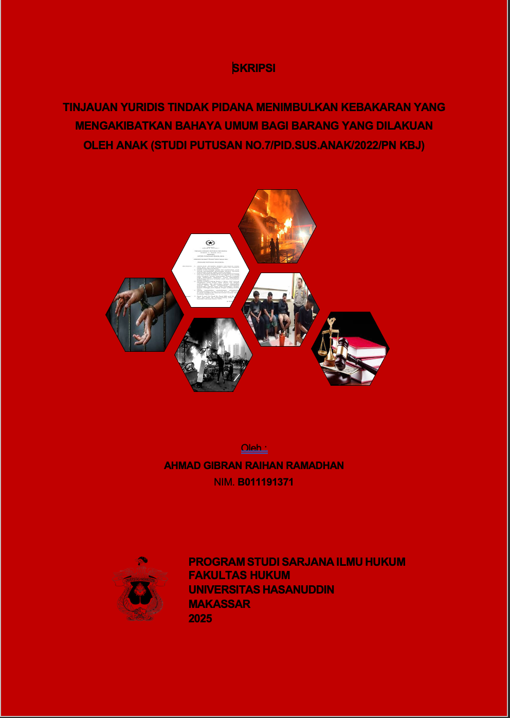 RAMADHAN, AHMAD GIBRAN RAIHAN (2025) TINJAUAN YURIDIS TINDAK PIDANA MENIMBULKAN KEBAKARAN YANG MENGAKIBATKAN BAHAYA UMUM BAGI BARANG YANG DILAKUAN OLEH ANAK (STUDI PUTUSAN NO.7/PID.SUS.ANAK/2022/PN KBJ) = JURIDICAL REVIEW OF THE CRIMINAL ACT OF CAUSING FIRE THAT RESULTS IN GENERAL DANGER TO PROPERTY COMMITTED BY A MINOR (CASE STUDY OF VERDICT NO.7/PID.SUS.ANAK/2022/PN KBJ). Skripsi thesis, Universitas Hasanuddin.