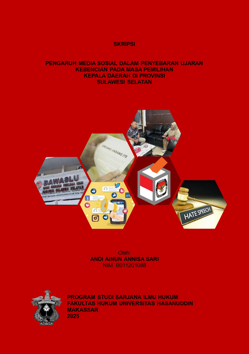 ANDI AINUN ANNISA SARI (B011201088). Pengaruh Media Sosial Dalam Penyebaran Ujaran Kebencian Pada Masa Pemilihan Kepala Daerah di Provinsi Sulawesi Selatan. Dibimbing oleh Rastiawaty sebagai pembimbing. Latar Belakang: Penelitian ini berawal dari meningkat dan berkelanjutannya fenomena penyebaran ujaran kebencian di media sosial setiap kali dilaksanakan pesta demokrasi, ujaran kebencian merupakan tindak pidana pelanggaran pemilihan sehingga penting untuk mengkaji fenomena ini dari aspek sosiologi hukum untuk kepentingan pelaksanaan pesta demokrasi yang tertib. Tujuan: Penelitian ini bertujuan untuk menganalisis media sosial dan budaya hukum sebagai faktor penyebab penyebaran ujaran kebencian serta mengidentifikasi bagaimana penanganan yang dilakukan oleh Badan Pengawas Pemilu Provinsi Sulawesi Selatan. Metode: Tipe penelitian yang digunakan adalah tipe penelitian empiris dengan pendekatan interdisipliner yang mengelaborasikan disiplin ilmu hukum serta ilmu komunikasi. Teknik pengumpulan data dilakukan melalui wawancara dengan berbagai pihak, pembagian kuesioner kepada sampel, observasi langsung di platform media sosial dan studi pustaka. Hasil: Penelitian menunjukkan bahwa (1) Media sosial dan budaya hukum sangat memengaruhi peningkatan penyebaran ujaran kebencian, sebanyak 25,71% responden memiliki kualitas kontrol sosial yang lemah dan sangat lemah. (2) Proses penanganan tindak pidana pelanggaran Pilkada telah sesuai dengan regulasi yang ada, hanya saja belum efektif penegakannya karena ada hambatan dari aspek regulasi dan aspek media sosial. Kesimpulan: Media sosial dan budaya hukum memberikan pengaruh terhadap peningkatan penyebaran ujaran kebencian pada masa pemilihan kepala daerah dan penanganan yang dilakukan belum efektif karena adanya hambatan, sehingga diperlukan penyempurnaan regulasi, peningkatan kesadaran hukum masyarakat dan pengembangan kecerdasan buatan media sosial sebagai upaya preventif penyebaran ujaran kebencian.