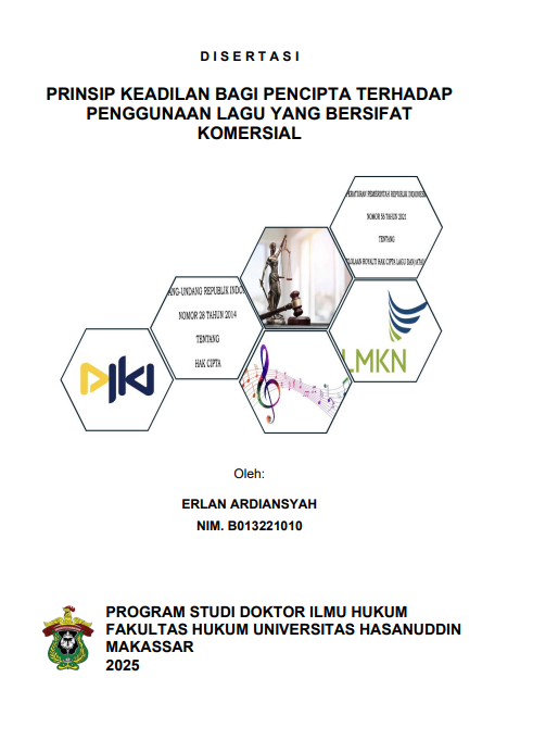 ERLAN ARDIANSYAH (B013221010). Prinsip Keadilan Bagi Pencipta Terhadap Penggunaan Lagu yang Bersifat Komersial. Dibimbing oleh Hasbir Paserangi, Winner Sitorus, Padma D. Liman. Latar Belakang: Pelanggaran hak cipta semakin marak terjadi tanpa ada konsekuensi hukum yang jelas, menjadikannya seolah hal yang biasa, sementara kinerja Lembaga Manajemen Kolektif Nasional (LMKN) dalam mengumpulkan royalti dan transparansi pengelolaan royalti masih jauh dari optimal, hanya mengakses sebagian kecil dari potensi royalti yang ada. Tujuan: penelitian ini bertujuan untuk menemukan dan mendeskripsikan hakikat keadilan, bentuk perlindungan hukum, serta merumuskan konsep ideal perlindungan hukum bagi pencipta lagu terkait penggunaan lagu ciptaannya secara komersial berdasarkan prinsip keadilan. Matode: Penelitian menggunakan metode hukum empiris dengan pendekatan kualitatif. Lokasi penelitian mencakup LMKN, LMK Wahana Musik Indonesia (WAMI), LMK Karya Cipta Indonesia (KCI), pengguna lagu komersial di Kota Palu, pencipta lagu, serta Direktorat Jenderal Kekayaan Intelektual. Data diperoleh dari wawancara, kuesioner, serta studi kepustakaan dan peraturan perundang-undangan. Hasil: (1) Hakikat keadilan bagi pencipta lagu terletak pada penghormatan atas hasil intelektual pencipta lagu, melalui perlindungan hak, pengakuan kepemilikan, dan distribusi manfaat yang adil melalui sistem hukum yang berpihak; (2) Perlindungan hukum masih lemah karena rendahnya kesadaran dan ketaatan hukum, lemahnya penegakan, serta kurangnya transparansi pengelolaan royalti; (3) Konsep ideal mencakup integrasi substansi hukum melalui regulasi teknis pengelolaan royalti berbasis data dan teknologi; struktur hukum melalui kelembagaan yang menggunakan sistem digitalisasi pengelolaan royalti; dan budaya hukum melalui edukasi hukum membangun kesadaran kolektif akan pentingnya hak cipta. Sinergi ketiganya mewujudkan perlindungan yang adil, aplikatif, dan mendukung ekosistem musik berkelanjutan. Kesimpulan: Diperlukan sistem hukum yang kuat dan berbasis teknologi untuk mewujudkan perlindungan hukum yang adil dan aplikatif bagi pencipta lagu. Kebaruan: Penelitian ini menawarkan konsep perlindungan hukum inovatif bagi pencipta lagu dengan mengintegrasikan struktur, substansi, dan budaya hukum dengan memanfaatkan teknologi digital untuk transparansi pengelolaan royalti dan penguatan kesadaran kolektif, sehingga menciptakan perlindungan yang aplikatif dan berkeadilan dalam hak cipta musik di Indonesia.