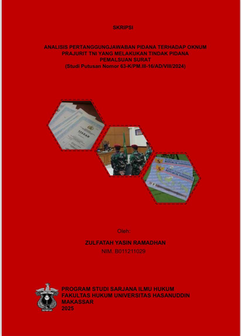 ZULFATAH YASIN RAMADHAN (B011211029), “Analisis Pertanggungjawaban Pidana Terhadap Oknum Prajurit TNI Yang Melakukan Tindak Pidana Pemalsuan Surat (Studi Putusan No. 63-K/PM.III-16/AD/VIII/2024)”. Dibawah bimbingan Amir Ilyas, sebagai pembimbing utama. Latar Belakang: Dalam proses penerimaan calon Anggota TNI dibutuhkan seorang calon prajurit yang berkompeten dan memenuhi syarat serta ketentuan yang ada pada saat proses pendaftaran, termasuk dengan menggunakan identitas asli tanpa ada surat yang dipalsukan. Hal ini untuk memastikan agar setiap calon prajurit terpilih dapat menjalankan tugas dan fungsinya dengan baik, yakni menjaga dan melindungi kedaulatan negara dari berbagai ancaman. Penelitian ini bertujuan untuk menganalisis kualifikasi pertanggungjawaban pidana atas pemalsuan Surat yang dilakukan oleh oknum prajurit TNI serta bagaimana pertimbangan hakim terhadap kasus pemalsuan Surat yang dilakukan oleh oknum prajurit TNI pada putusan No. 63-K/PM.III- 16/AD/VIII/2024. Metode: Penelitian ini merupakan jenis penelitian hukum normatif, dengan bahan hukum primer dan sekunder, yang dianalisis secara preskriptif normatif. Hasil: (1) Pengaturan mengenai tindak pidana pemalsuan surat telah diatur didalam pasal 263 Ayat (1) Kitab Undang-Undang Hukum Pidana, oleh karenanya terhadap oknum anggota TNI yang melakukan tindak pidana pemalsuan Surat tersebut dapat dimintai pertanggungjawaban pidana. (2) Hakim melakukan pertimbangan terhadap aspek yuridis dan aspek nonyuridis. Aspek yuridis yang menjadi pertimbangan hakim berupa dakwaan penuntut umum, keterangan saksi, keterangan terdakwa, serta barang bukti yang diajukan didalam persidangan. Kesimpulan: Pertimbangan non-yuridis hakim meliputi keadaan yang memberatkan dan meringankan terdakwa. Kesimpulan, Pertimbangan hakim dalam menjatuhkan putusan menurut penulis kurang tepat karena hakim hanya mempertimbangkan kepentingan militer yang dirugikan tanpa mempertimbangkan kerugian yang dialami oleh orang lain.