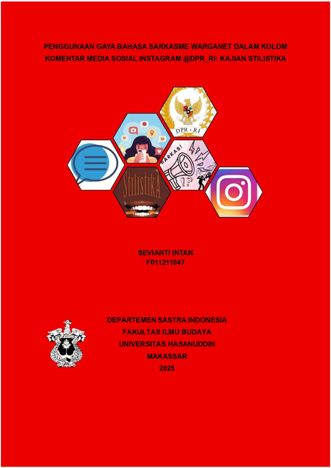 SEVIANTI INTAN. Penggunaan Gaya Bahasa Sarkasme Warganet dalam Kolom Komentar Media Sosial Instagram @dpr_ri: Kajian Stilistika (dibimbing oleh Muhammad Darwis). Penelitian ini bertujuan 1) mendeskripsikan pembentukan gaya bahasa sarkasme yang digunakan oleh warganet di instagram dan 2) menjelaskan penggunaan metafora dalam pewudan gaya bahasa sarkasme di instagram @dpr_ri. Pendekatan yang digunakan adalah stilistika. Jenis penelitian yang digunakan dalam penelitian ini adalah penelitian kualitatif. Metode pengumpulan data yang digunakan dalam penelitian ini yaitu metode simak dengan menggunakan teknik tangkap layar (screenshot), dan catat. Metode analisis data yang digunakan yaitu metode deskriptif untuk mendapatkan gambaran yang jelas mengenai penggunaan gaya bahasa sarkasme oleh warganet di instagram. Hasil penelitian menunjukkan bahwa (1) sarkasme sering kali dibentuk melalui unsur ejekan, olok-olokan, dan cemoohan sebagai strategi retoris untuk menyampaikan ketidakpuasan, sindiran, atau protes secara halus namun tajam. (2) Penggunaan metafora dalam pewujudan bahasa sarkasme mulai dari ungkapan berasosiasi pada binatang, manusia, penyakit, konstruksi, uang, dan kekuatan, sebagai sarana kritik yang tajam namun terselubung.