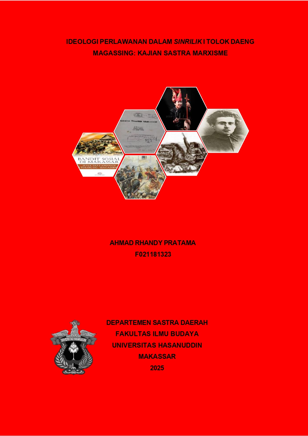 Ahmad Rhandy Pratama, 2025. Skripsi ini berjudul “Ideologi Perlawanan dalam Sinrilik I Tolok Daeng Magassing: Kajian Sastra Marxis”. Depertemen Sastra Daerah Fakultas Ilmu budaya Universitas Hasanuddin. (Dibimbing oleh Prof.Dr. Andi Muhammad Akhmar, S.S.,M.Hum.) Skripsi ini berusaha untuk melakukan pembacaan dan analisis atas ideologi perlawanan yang termuat dalam Sinrilik I Tolok Daeng Magassing, dengan menggunakan teori Couter-Hegemoni Antonio Gramsci. fokus akan diberikan pada bagaimana perlawanan I Tolok Daeng Magassing dalam Sinrilik I Tolok Daeng Magassing Merepresentasikan Gerakan Couter-Hegemoni terhadap kekuasaan yang dominan. Metode penelitian yang digunakan dalam Skripsi ini adalah Metode kualitatif dengan pendekatan Strukturalisme Genetik Lucien Goldmann. Adapun data yang digunakan adalah teks Sinrilik I Tolok Daeng Magassing yang akan dianalisis secara deskriptif kualitatif. Hasil Penelitian menunjuakan Sinrilik I Tolok Daeng Magassing tidak dapat dilepaskan dari konteks sosial-sejarah masyarakat Bugis- Makassar pada masa kolonial. Sebagai sebuah karya sastra tradisional, sinrilik ini lahir di tengah dinamika perlawanan terhadap dominasi kolonial yang mengancam kesejahteraan politik dan budaya masyarakat lokal. Dalam hal ini, Sinrilik I Tolok Daeng Magassing menjadi produk budaya yang mencerminkan kontradiksi antara kekuasaan kolonial yang hegemonik dan aspirasi rakyat untuk mempertahankan identitas serta pengawasannya.
