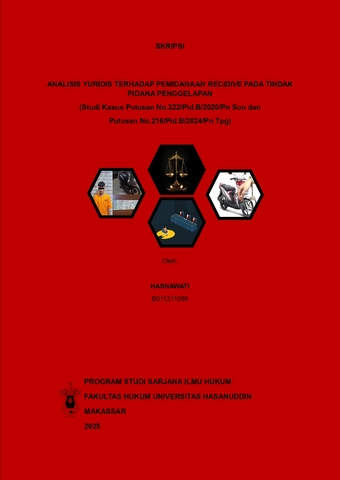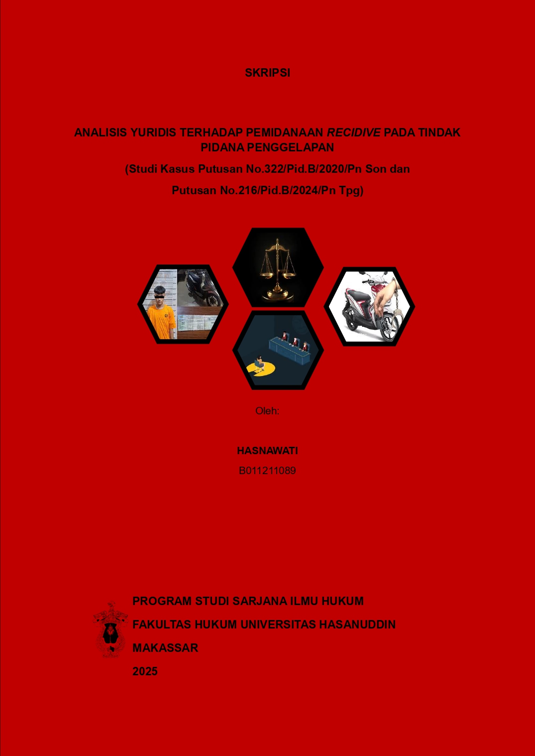 Hasnawati (B011211089). Analisis Yuridis Terhadap Pemidanaan Recidive Pada Tindak Pidana Penggelapan (Studi Kasus Putusan No.322/Pid.B/2020/Pn Son dan Putusan No.162/Pid.B/2024/Pn Tpg). Dibimbing oleh Hijrah Adhyanti Mirzana sebagai Pembimbing. Latar belakang: Realitas penegakan hukum terhadap tindak pidana penggelapan menunjukkan bahwa, meskipun telah diatur ancaman pidana lebih berat bagi pelaku recidive, kasus serupa masih sering terjadi. Ironisnya, penerapan hukum masih belum konsisten, seperti terlihat pada Putusan No. 322/Pid.B/2020/PN Son dengan hukuman 4 tahun penjara, sementara pada Putusan No. 322/Pid.B/2020/PN hanya dijatuhkan hukuman 2 tahun 6 bulan. Tujuan: Untuk menganalisis penerapan hukum pidana materil dan pertimbangan hukum hakim dalam menjatuhkan sanksi terhadap recidive pada tindak pidana penggelapan dalam Putusan No. 322/Pid.B/2020/Pn Son dan No. 162/Pid.B/2024/Pn Tpg. Metode: Metode penelitian normatif dengan pendekatan perundang-undangan dan pendekatan kepustakaan. Hasil: Hasil penelitian menunjukan bahwa (1) Penerapan hukum pidana materiil terhadap recidive dalam perkara penggelapan pada Putusan No.322/Pid.B/2020/PN Son dan No. 216/Pid.B/2024/PN Tpg dinilai kurang tepat. Meskipun secara yuridis unsur pembuktian telah terpenuhi, hakim tidak konsisten mencantumkan pasal tentang recidive dan keliru menilai jangka waktu pengulangan tindak pidana, sehingga pemberatan pidana tidak sesuai dengan Pasal 486 KUHP. (2) Pertimbangan hakim pada kedua putusan memiliki beberapa kekurangan, yaitu menjadikan status recidive sebagai alasan sosiologis bukan sebagai alasan yuridis serta tidak memperhatikan jangka waktu pengulangan tindak pidana. Pertimbangan hakim pada kedua putusan memiliki kesamaan karakteristik, namun terdapat perbedaan dalam penjatuhan hukuman. Perbedaan tersebut mencerminkan disparitas pemidanaan antar yurisdiksi pengadilan. Kesimpulan: Penerapan hukum pidana materiil terhadap residivis pada Putusan No.322/Pid.B/2020/Pn Son dan No. 216/Pid.B/2024/Pn Tpg dinilai kurang tepat. Unsur tindak pidana penggelapan terbukti secara sah di kedua perkara, namun sanksi tidak konsisten. Pada Putusan No. 322, terdakwa yang bukan recidive justru dijatuhi 4 tahun penjara, sedangkan pada Putusan No. 216, terdakwa yang memenuhi syarat recidive hanya dihukum 1 tahun 6 bulan. Pertimbangan hakim keliru karena menjadikan status recidive sebagai alasan sosiologis, bukan yuridis, padahal Pasal 486 KUHP mengatur tegas pemberatan hukuman bagi recidive. Pada Putusan No. 322, status recidive dipertimbangkan meski tidak terpenuhi, sedangkan pada No. 216 tidak digunakan sebagai dasar pemberatan. Hal ini menimbulkan disparitas pidana tipe Inter-jurisdictional Disparity antar pengadilan.