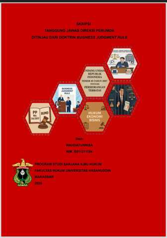 ABSTRAK WAHDATUNNISA (B011211104) “Tanggung Jawab Direksi PERUMDA Ditinjau dari Doktrin Business Judgment Rule”, dibimbing oleh Ahmadi Miru. Latar Belakang: Direksi BUMD kerap kali mengambil keputusan yang menimbulkan kerugian, yang kemudian dipermasalahkan secara hukum apabila kerugian tersebut diindikasikan mengandung unsur kesalahan atau kelalaian dalam pengambilan keputusan. Dalam konteks ini, doktrin Business Judgment Rule menjadi penting untuk menilai apakah keputusan tersebut dapat dipertanggungjawabkan secara hukum. Tujuan: Penelitian ini bertujuan untuk menganalisis dan mengevaluasi tanggung jawab hukum direksi Perumda dalam pengambilan keputusan bisnis berdasarkan doktrin Business Judgment Rule. Metode: Penelitian ini merupakan penelitian hukum normatif dengan pendekatan perundang-undangan, pendekatan kasus dan pendekatan konseptual. Menggunakan bahan hukum primer, sekunder dan tersier yang dianalisis secara kualitatif dengan logika deduktif. Hasil: (1) pertimbangan hakim dalam kasus Direktur Umum PD Parkir Makassar Raya belum mencerminkan penerapan doktrin Business Judgment Rule, sedangkan pada kasus Direktur Umum PDAM Makassar sudah mencerminkan penerapan doktrin tersebut; (2) batasan tanggung jawab direksi Perumda dalam pengambilan keputusan bisnis terletak pada adanya iktikad baik, tanpa konflik kepentingan, berdasarkan informasi yang memadai, untuk kepentingan terbaik dan tujuan perusahaan, serta bukan karena kesalahan atau kelalaiannya dan disertai upaya mencegah kerugian sebagaimana tercermin dalam elemen-elemen utama doktrin Business Judgment Rule. Kesimpulan: Penelitian ini menyimpulkan bahwa pertimbangan hakim belum konsisten jika dikaitkan dengan doktrin Business Judgment Rule, namun sebagian besar sudah sejalan dengan unsur-unsur dari doktrin tersebut. Adapun batasan tanggung jawab direksi Perumda harus memenuhi unsur-unsur dari doktrin Business Judgment Rule khususnya pada Pasal 68 PP BUMD.