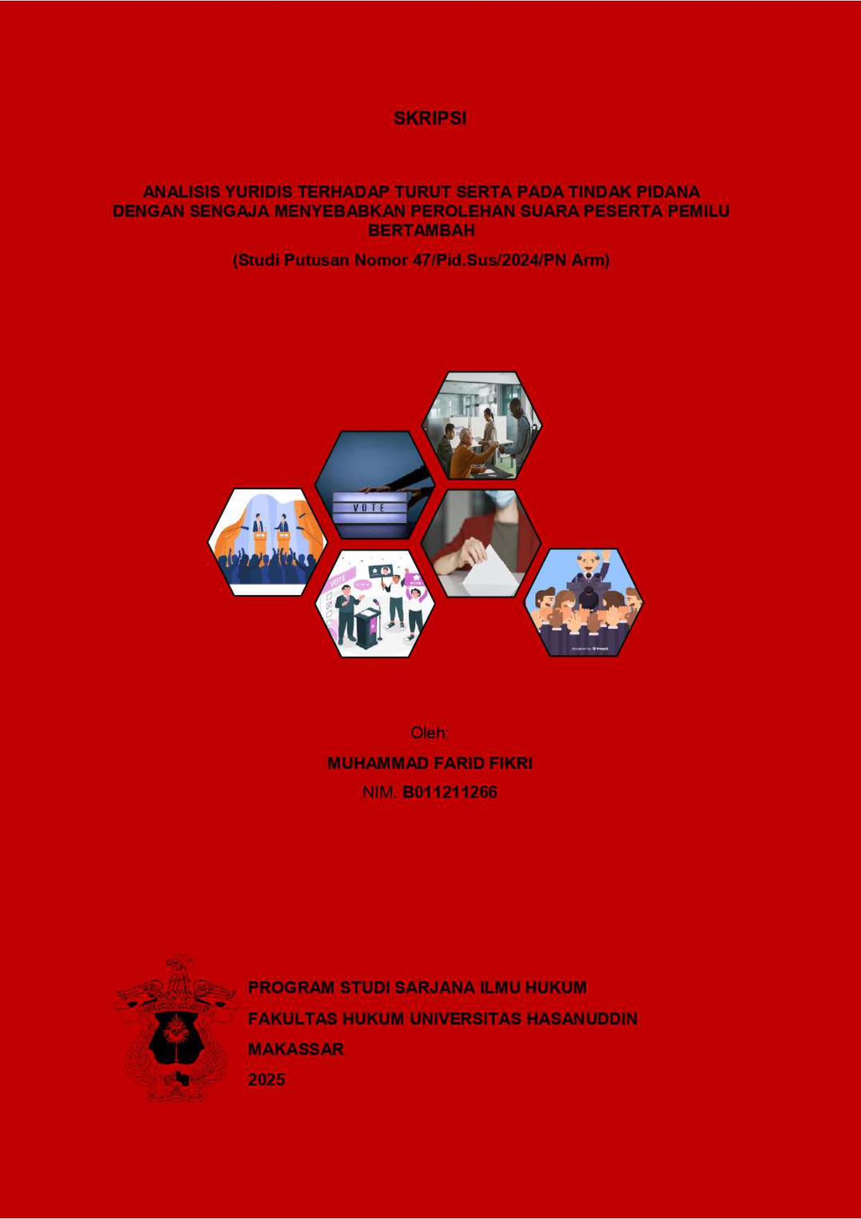 FIKRI, MUHAMMAD FARID (2025) ANALISIS YURIDIS TERHADAP TURUT SERTA PADA TINDAK PIDANA DENGAN SENGAJA MENYEBABKAN PEROLEHAN SUARA PESERTA PEMILU BERTAMBAH (Studi Putusan Nomor 47/Pid.Sus/2024/PN Arm) = JURIDICAL ANALYSIS OF CONTRIBUTION TO THE CRIME OF INTENTIONALLY CAUSING THE VOTES OF AN ELECTION PARTICIPANT TO INCREASE (Study of Verdict Number 47/Pid.Sus/2024/PN Arm). Skripsi thesis, Universitas Hasanuddin.