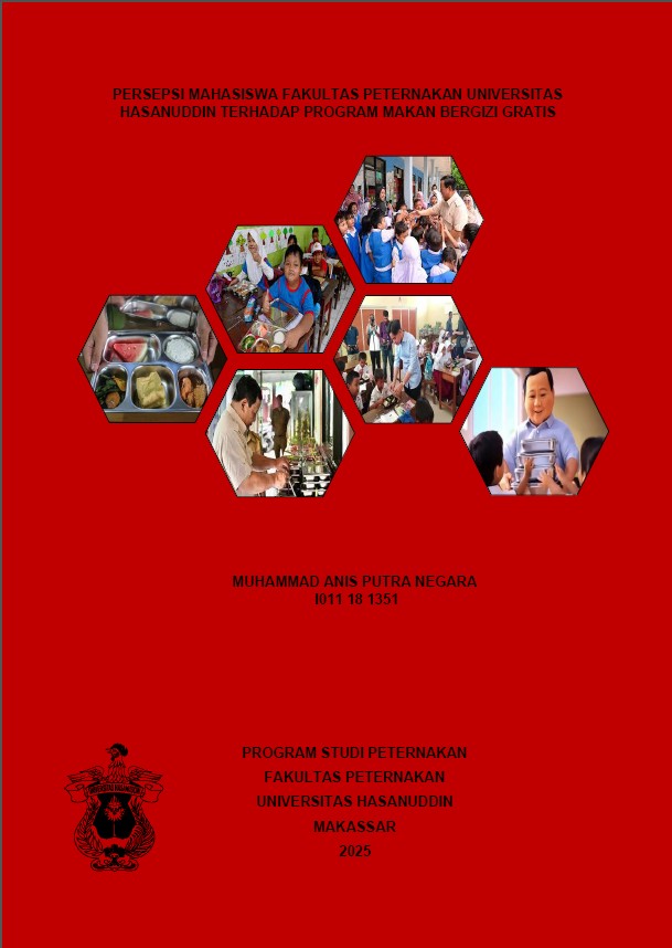 Muhammad Anis Putra Negara. I011181351. Persepsi Mahasiswa Fakultas Peternakan Universitas Hasanuddin terhadap Program Makan Bergizi Gratis. (dibimbing oleh Prof. Dr. Syahdar Baba, S.Pt., M.Si) Pemerintah Indonesia saat ini membuat program nasional Makan Bergizi Gratis yang rencananya menyasar pelajar, anak PAUD, ibu hamil dan daerah 3T (Tertinggal, Terdepan, dan Terluar) untuk memenuhi kekurangan gizi sejak dini. Program ini dicanangkan dapat menurunkan angka stunting, memperkuat fisik, serta dapat menunjang prestasi di akademiknya.Tujuan Penelitian mengenai Persepsi Mahasiswa Fakultas Peternakan Universitas Hasanuddin terhadap Program Makan Bergizi Gratis yaitu untuk mengetahui Persepsi Mahasiswa Fakultas Peternakan Universitas Hasanuddin terhadap Program Makan Bergizi Gratis. Penelitian Mengenai Persepsi Mahasiswa Fakultas Peternakan Universitas Hasanuddin terhadap Program Makan Bergizi Gratis dilaksanakan pada bulan juni 2025 hingga juli 2025. Pengumpulan data dengan cara observasi, wawancara dan kuesioner. Persepsi Mahasiswa Fakultas Peternakan Universitas Hasanuddin terhadap Program Makan Bergizi Gratis. sub variabel tujuan program berada dalam kategori agak tinggi dengan skor 487. sub variabel Manfaat bagi sektor peternakan terdapat skor sebanyak 271 masuk pada kategori agak tinggi. Variabel dampak terhadap dunia peternakan didapatkan skornya 389 yang masuk dalam kategori agak tinggi. sub variabel pelaksanaan program skornya sebanyak 450 masuk pada kategori tinggi. Berdasarkan hasil tersebut secara umum mahasiswa mempunyai pemahaman dan pandangan yang cukup baik terhadap program tersebut.