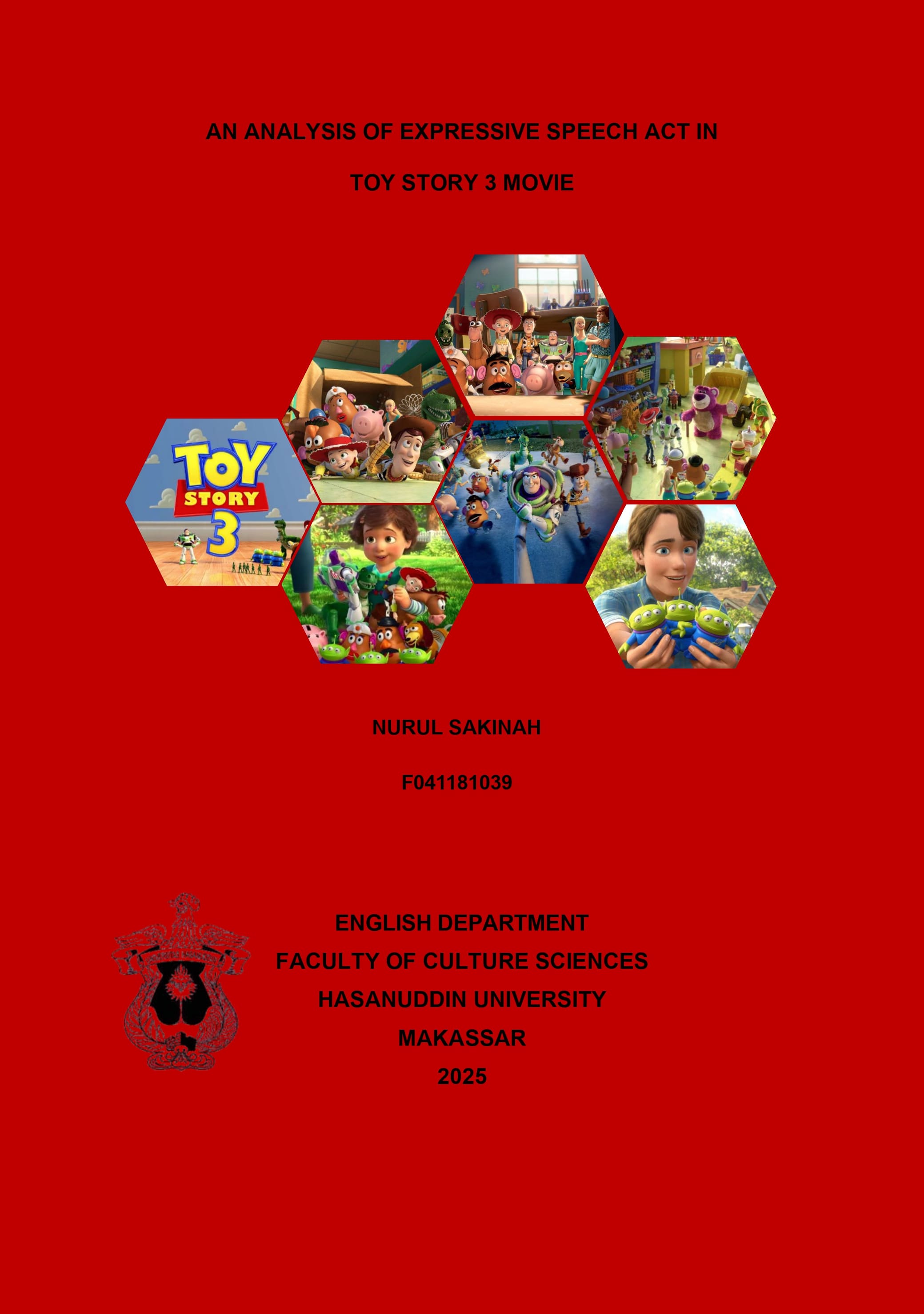 Nurul Sakinah. 2025. An Analysis of Expressive Speech Acts In Toy Story 3 Movie (Supervised by Abbas and M. Syafri Badaruddin) This thesis entitled “An Analysis of Expressive Speech Acts In Toy Story 3 Movie”. This study aims to identify the types of expressive speech acts found in the film Toy Story 3 and determine which speech acts are most frequently used in this film. This study uses Searle's theory (1976) which categories expressive speech acts into six parts, they are: Expressive of Thanking, Expressive of Apologizing, Expressive of Congratulating, Expressive of Greeting, Expressive of Wishing, Expressive of Attitude. The method used in data collection is observation, while the technique used is note taking. In analyzing the data, the researcher used a qualitative descriptive method. From the data, it is found some utterances that containing kinds of expressive by Searle. The data of this study were taken from the utterances contained in the film. There are 47 expressive speech acts in the film consisting of 13 expressive of thanking, 3 expressive of apologizing, 8 expressive of congratulating, 11 expressive of greeting, 5 expressive of wishing, 7 expressive attitude. Based on expressive speech acts found in the study, expression of gratitude is the most frequently used in the film Toy Story 3.