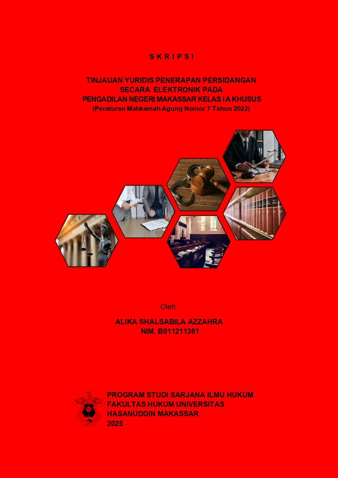 ALIKA SHALSABILA AZZAHRA (B011211361). “Tinjauan Yuridis Penerapan Persidangan Secara Elektronik pada Pengadilan Negeri Makassar Kelas I A Khusus (Peraturan Mahkamah Agung Nomor 7 Tahun 2022)”. Dibimbing oleh Andi Tenri Famauri Rifai sebagai Pembimbing. Latar Belakang: Persidangan elektronik merupakan bentuk pemanfaatan teknologi informasi dalam sistem peradilan perdata, yang diatur dalam Peraturan Mahkamah Agung Nomor 7 Tahun 2022. Tujuan: Penelitian ini bertujuan untuk menganalisis implementasi persidangan secara elektronik di Pengadilan Negeri Makassar Kelas I A Khusus, serta untuk mengevaluasi faktor hukum, penegak hukum, dan sarana prasarana yang mempengaruhi keberhasilan penerapan sistem ini. Metode: Penelitian ini menggunakan tipe penelitian hukum empiris dengan menggunakan 2 jenis sumber, yaitu primer (melalui wawancara dan data) dan sekunder (melalui pendekatan perundang- undangan, karya ilmiah, dan buku). Hasil: Penelitian menunjukan bahwa (1) Implementasi PERMA No. 7 Tahun 2022 di Pengadilan Negeri Makassar telah menunjukkan pergeseran menuju peradilan yang lebih cepat, sederhana, dan biaya ringan, namun masih dihadapkan pada hambatan teknis berupa kepastian penerimaan surat. (2) Faktor hukum dan penegak hukum memainkan peran yang sangat penting dalam efektivitas persidangan elektronik, tetapi masih memerlukan peningkatan sarana dan prasarana untuk mencapai optimalisasi. Kesimpulan: Penerapan persidangan elektronik di Pengadilan Negeri Makassar sudah mencerminkan asas peradilan yang sederhana, cepat, dan biaya ringan sebagaimana diatur dalam PERMA, namun efektivitasnya masih terhambat oleh kendala teknis terutama dalam aspek infrastruktur dan kepastian penerimaan dokumen secara elektronik, sehingga diperlukan penguatan sistem dan peningkatan kapasitas sumber daya manusia secara berkelanjutan.