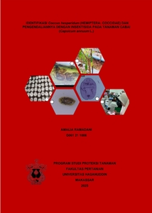 AMALIA RAMADANI. Identifikasi Coccus hesperidum (Hemiptera: Coccidae) dan pengendaliannya dengan insektisida pada tanaman cabai (Capsicum annuum L.) (dibimbing oleh: Andi Nasruddin). Latar Belakang. Coccus sp. merupakan hama yang dapat menyebabkan kerusakan serius pada berbagai spesies tanaman dengan cara mengisap cairan tanaman sehingga dapat mengakibatkan daun menguning, layu, dan gugur, batang mengering, serta ranting-ranting meranggas hingga akhirnya tanaman mati. Dari survei lapangan di beberapa kabupaten di Sulawesi Selatan ditemukan banyak tanaman cabai mati akibat terserang Coccus sp. Serangga ini belum pernah dilaporkan menyerang dan menyebabkan kerusakan berat pada tanaman cabai. Tujuan. Penelitian ini bertujuan untuk mengetahui jenis spesies hama baru tersebut dan efektivitas beberapa insektisda sintetik di dalam mengendalikannya pada tanaman cabai. Metode. Rancangan yang digunakan dalam penelitian ini adalah rancangan acak lengkap. Perlakuan yang diuji yaitu beberapa jenis insektisida dan konsentrasi yang berbeda. Adapun jenis insektisida yang digunakan yaitu Kanon, Demolish, Curacron, Matador, Biagro, Virtako, dan Avidor dengan konsentrasi 0,2; 1; 5 × dosis anjuran. Hasil. Spesimen hama baru yang menyerang pertanaman cabai di Sulawesi Selatan adalah Coccus hesperidum. Hasil uji efektivitas insektisida menunjukkan terdapat enam insektisida yang efektif dalam mengendalikan C. hesperidium dengan konsentrasi yang berbeda. Kesimpulan. Hama baru yang menyerang pertanaman cabai di Sulawesi Selatan adalah C. hesperidum. Penelitian yang telah dilakukan ditemukan enam insektisida sintetik dan organik yang diuji efektif mengendalikan hama tersebut.