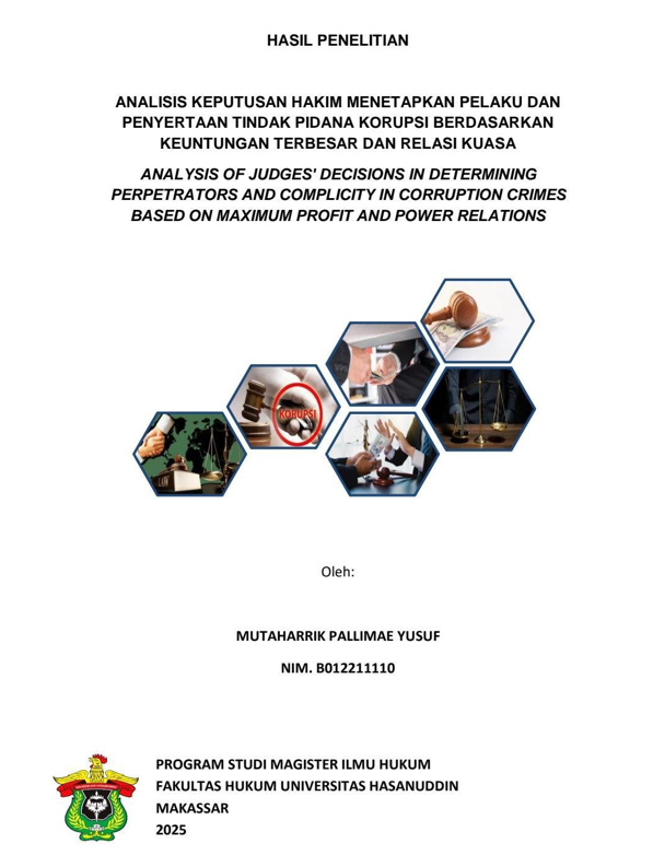 Mutaharrik Pallimae Yusuf (B012211110) “Analisis Keputusan Hakim Menetapkan Pelaku Dan Penyertaan Tindak Pidana Korupsi Berdasarkan Keuntungan Terbesar Dan Relasi Kuasa Dibimbing oleh Hijrah Adhyanti Mirzana Latar Belakang: Penyertaan dalam tindak pidana korupsi melibatkan sejumlah pelaku dengan tingkat kewenangan berbeda, sehingga pemberlakuan tanggung jawab pidana harus proporsional dan adil. Tujuan: Penelitian ini bertujuan untuk mengkaji dan manganalisis perolehan keuntungan terbesar dan jabatan yang lebih tinggi menjadi dasar pertimbangan hakim menetapkan pelaku dan penyertaan dalam kasus tindak pidana korupsi dan manganalisis penetapan pelaku dan penyertaan dalam kasus tindak pidana korupsi berdasarkan keuntungan terbesar dan jabatan yang lebih tinggi dapat menjamin prinsip keadilan. Metode: penelitian yang digunakan adalah metode normatif dan pendekatan perundang-undangan dengan fokus pada data primer dan sekunder yang dianalisis secara deskriptif. Hasil: Temuan menunjukkan bahwa (1) pimpinan dengan kewenangan dominan umumnya dikualifikasi sebagai pelaku utama dan ditempatkan pada kategori kesalahan "tinggi", sedangkan bawahan tergolong "rendah"; (2) meski hakim mengikuti enam tahap PERMA secara formil, rentang penjara dan denda kerap dipangkas di bawah batas minimum tanpa alasan luar biasa; (3) ketidakterukuran indikator kontribusi faktual dan mens rea kolektif menjadi sumber utama disparitas. Kesimpulan: Kerangka PERMA efektif sebagai pedoman dasar, namun membutuhkan pedoman teknis dan pendidikan berkelanjutan agar hakim mampu mengkalibrasi peran pelaku secara terukur dan transparan. Penyempurnaan ini krusial untuk memastikan sanksi pidana selaras dengan tingkat keterlibatan, sekaligus menegakkan prinsip keadilan substantif dalam pemberantasan korupsi.