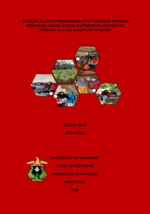 Sektor pertanian merupakan penunjang bagi sebagian besar negara berkembang, karena dapat menyerap tenaga kerja dalam jumlah yang besar. Namun tenaga kerja yang bekerja di sektor pertanian justru menerima upah yang lebih rendah dibandingkan dengan sektor lain. Sektor pertanian berperan penting dalam melakukan transformasi struktural dalam pembangunan ekonomi dan membangun kehidupan masyarakat di pedesaan. Oleh karena itu, diperlukan upaya untuk meningkatkan produksi jagung dengan penggunaan input produksi yang efektif dan efisien agar dapat menghasilkan produksi usahatani yang maksimal yang berdampak pada peningkatan pendapatan petani. Tujuan dari penelitian ini adalah untuk menganalisis pengaruh penggunaan input produksi dan tingkat efisiensi alokatif produksi usahatani jagung di Desa Bantimurung, Kecamatan Tondong Tallasa, Kabupaten Pangkep. Dengan menggunakan metode analisis produksi Cobb- Douglas dan analisis Nilai Produk Marjinal (NPM) usahatani jagung. Hasil penelitian menunjukkan bahwa secara simultan luas lahan, benih, pupuk Urea, pupuk NPK, pestisida, tenaga kerja pengolahan tanah, tenaga kerja penanaman, tenaga kerja pemupukan, tenaga kerja penyiangan, tenaga kerja pengendalian hama dan tenaga kerja pemanenan berpengaruh terhadap produksi jagung dengan besar pengaruh 80%. Ada sembilan variabel produksi yang penggunaanya belum efisien yaitu variabel Luas Lahan, Pupuk Urea, Pupuk NPK, Pestisida, Tenaga Kerja Penanaman, Tenaga Kerja Pemupukan, Tenaga Kerja Penyiangan, Tenaga Kerja Pengendalian Hama, dan Tenaga Kerja Pemanenan, sehingga diperlukan penambahan input agar produksi jagung optimum. Sedangkan dua variabel lainnya yaitu Benih dan Tenaga Kerja Pengolahan Tanah penggunaannya tidak efisien atau berlebihan sehingga diperlukan pengurangan input agar produksi jagung optimum.