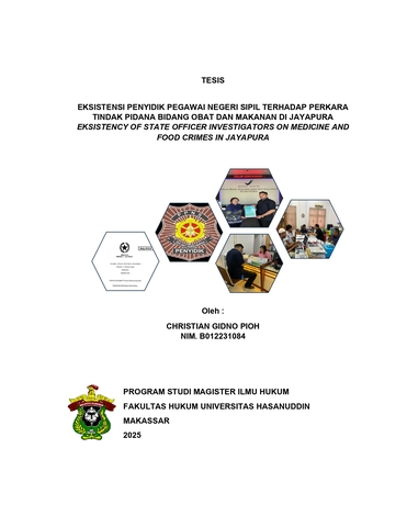CHRISTIAN GIDNO PIOH (B012231028), eksistensi penyidik pegawai negeri sipil terhadap perkara tindak pidana bidang obat dan makanan di jayapura, dibimbing oleh WIWIE HERYANI sebagai Pembimbing. Latar Belakang: Kesehatan masyarakat merupakan hak asasi manusia yang harus dijaga, termasuk melalui pengawasan obat dan makanan. Namun, peredaran obat dan makanan ilegal masih marak, sehingga diperlukan peran aktif Penyidik Pegawai Negeri Sipil (PPNS) Balai Besar Pengawas Obat dan Makanan (BBPOM) Jayapura dalam penegakan hukum. Tujuan: Menganalisis eksistensi dan kendala PPNS BBPOM Jayapura dalam penegakan hukum tindak pidana obat dan makanan untuk meningkatkan efektivitas pengawasan dan perlindungan kesehatan masyarakat. Metode: Penelitian ini menggunakan metode penelitian hukum normatif-empiris dengan pendekatan perundang-undangan, konseptual, dan kasus, serta pengumpulan data melalui studi dokumen dan wawancara dengan narasumber terkait. Hasil: Hasil penelitian menunjukkan bahwa PPNS BBPOM Jayapura telah menangani 13 perkara dalam tiga tahun terakhir, namun efektivitasnya terhambat oleh keterbatasan kewenangan, sumber daya manusia, dan sarana prasarana. Selain itu, regulasi yang lemah, seperti ketiadaan ketentuan penahanan dalam UU Kesehatan, serta resistensi dari pelaku usaha dan masyarakat, menjadi tantangan utama. Kendala internal meliputi keterbatasan sarana prasarana, regulasi teknis yang lemah, dan jumlah PPNS yang tidak memadai. Sementara itu, kendala eksternal berupa koordinasi dengan instansi lain, resistensi masyarakat dan peran media yang kurang mendukung. Kesimpulan: Eksistensi PPNS BBPOM Jayapura sangat vital dalam penegakan hukum di bidang obat dan makanan, namun diperlukan peningkatan kewenangan, sumber daya, dan koordinasi antar lembaga untuk meningkatkan efektivitas penegakan hukum. Rekomendasi penelitian ini mencakup penyempurnaan regulasi, penambahan jumlah penyidik, dan peningkatan kesadaran hukum masyarakat melalui edukasi yang lebih intensif. Kata Kunci: PPNS, BBPOM, Tindak Pidana Obat dan Makanan