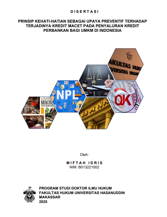 MIFTAH IDRIS (B013221002). Prinsip Kehati-hatian Sebagai Upaya Preventif Terhadap Terjadinya Kredit Macet Dalam Penyaluran Kredit Perbankan Bagi UMKM Di Indonesia. Dibimbing oleh Hasbir Paserangi, Padma D. Liman dan Oky Deviany sebagai Pembimbing. Latar Belakang: Peran strategis bank dalam mendukung pertumbuhan UMKM di Indonesia yang menyerap banyak tenaga kerja nasional, namun masih menghadapi permasalahan kredit macet (non-performing loan) yang mengancam stabilitas perbankan dan perekonomian nasional. Tujuan: (1) Menganalisis peran PUJK dan OJK menerapkan regulasi prinsip kehati-hatian dalam penyaluran kredit bagi UMKM di Indonesia; (2) Mengevaluasi regulasi prinsip kehati-hatian sebagai upaya preventif terhadap terjadinya Kredit macet melindungi kepentingan hukum PUJK sebagai kreditur dan pelaku UMKM sebagai debitur. (3) Membangun konsep Ideal penerapan prinsip kehati-hatian penyaluran kredit perbankan bagi UMKM di Indonesia. Metode: Penelitian hukum normatif-empiris, dengan pendekatan perundang-undangan, perbandingan, dan konsep, dengan data empiris dari PUJK, OJK, dan UMKM, periode 2018–2024 yang mencakup fase pra-pandemi, pandemi, dan pasca-pandemi Covid-19 yang dianalisis menggunakan analisis data dan bahan hukum kualitatif. Hasil: (1) PUJK dan OJK telah menjalankan fungsi regulasi dan pengawasan, namun masih menghadapi kendala perbedaan operasional antar bank serta keterbatasan SDM dan teknologi; (2) Regulasi prinsip kehati-hatian efektif di bank besar, tetapi belum optimal di BPR sehingga kredit macet UMKM masih tinggi; (3) Tantangan signifikan masih ada dari sisi struktur kelembagaan dan substansi regulasi dalam penyaluran kredit UMKM. Kesimpulan: Penerapan prinsip kehati-hatian perlu penguatan regulasi, peningkatan kapasitas SDM, dan pemanfaatan teknologi untuk mengatasi hambatan dan meningkatkan perlindungan serta stabilitas pembiayaan UMKM. Kebaruan: Penguatan regulasi preventif dengan sistem Risk Assessment 7C+AI, Skema jaminan Dynamic Collateral Pooling untuk UMKM, dan Mekanisme pengawasan hybrid terkoordinasi seperti di AS.