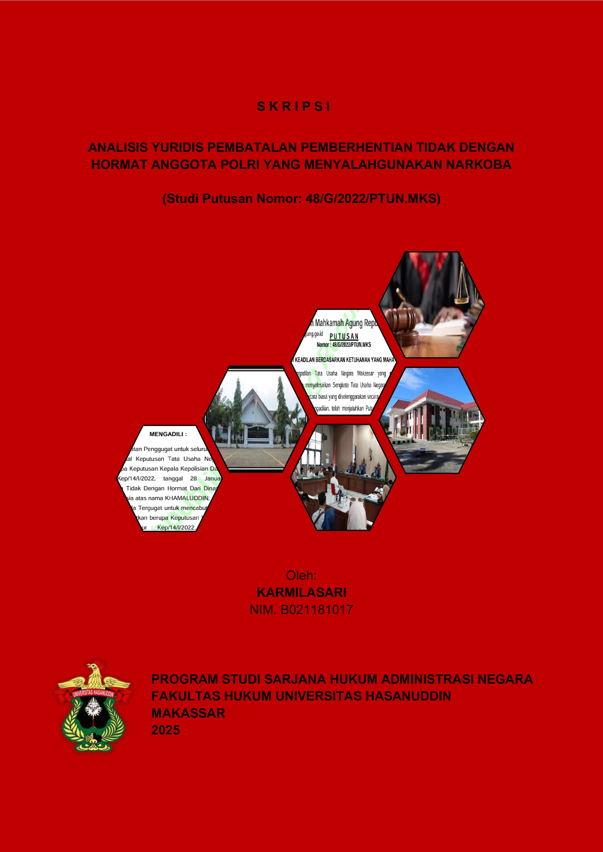 KARMILASARI, KARMILASARI (2025) Analisis Yuridis Pembatalan Pemberhentian Tidak Dengan Hormat Anggota Polri Yang Menyalahgunakan Narkoba (Studi Putusan Nomor: 48/G/2022/PTUN.MKS) = Legal Analysis of the Cancellation of Dishonorable Discharges of Police Officers Who Abuse Drugs (Study of Decision Number: 48/G/2022/PTUN.MKS). Skripsi thesis, Universitas Hasanuddin.
