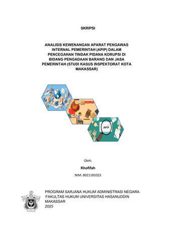 ABSTRAK KHOFIFAH (B021181023), ” Analisis Kewenangan Aparat Pengawas Internal Pemerintah (APIP) Dalam Pencegahan Tindak Pidana Korupsi Di Bidang Pengadaan Barang dan Jasa Pemerintah (Studi Kasus Inspektorat Kota Makassar)”. Dibawah bimbingan Hamzah Halim, sebagai pembimbing utama dan Andi Muhammad Aswin Anas, selaku pembimbing pendamping. Aparat Pengawas Internal Pemerintah memiliki peran penting dalam pencegaan tindak pidana korupsi, termasuk dalam pengadaan barang dan jasa. Serta kewenangan Inspektorat Daerah dalam melakukan pengawasan tindak pidana korupsi pengadaan barang dan jasa. Tujuan penelitian ini adalah untuk menganalisis kewenangan aparat pengawasan internal pemerintah dalam pencegahan tindak pidana korupsi di bidang pengadaan barang dan jasa. Metode yang digunakan dalam penelitian ini adalah menggunakan jenis penelitian empiris, berlokasi di Inspektorat Kota Makassar, data diperoleh melalui wawancara dengan pegawai Inspektorat serta analisis bahan hukum dengan cara perskriptif empiris. Hasil dari penelitian ini menunjukan bahwa (1) Pelaksanaan pengawasan oleh Apip telah dilakukan sesuai dengan Peraturan Menteri Dalam Negeri Nomor 19 Tahun 2023 . Namun dalam penerapannya masih terdapat beberapa faktor penghambat. (2) Faktor penghambat dalam implementasi pelaksanaan pengawasan oleh APIP dalam pencegahan tindak pidana korupsi pengadaan barang dan jasa pemerintah daerah masih menghadapi berbagai faktor seperti faktor penegakan hukum, faktor sarana dan faslitas, faktor hukum. Kesimpulan dari penelitian ini adalah pelaksanaan pengawasan oleh APIP telah berjalan sesuai dengan aturan yang ditetapkan. Meskipun masih terdapat beberapa faktor penghambat dalam pelaksanaan pengawasan oleh APIP. Kata Kunci: APIP; Kewenangan; Pengawasan; Pencegahan Korupsi.