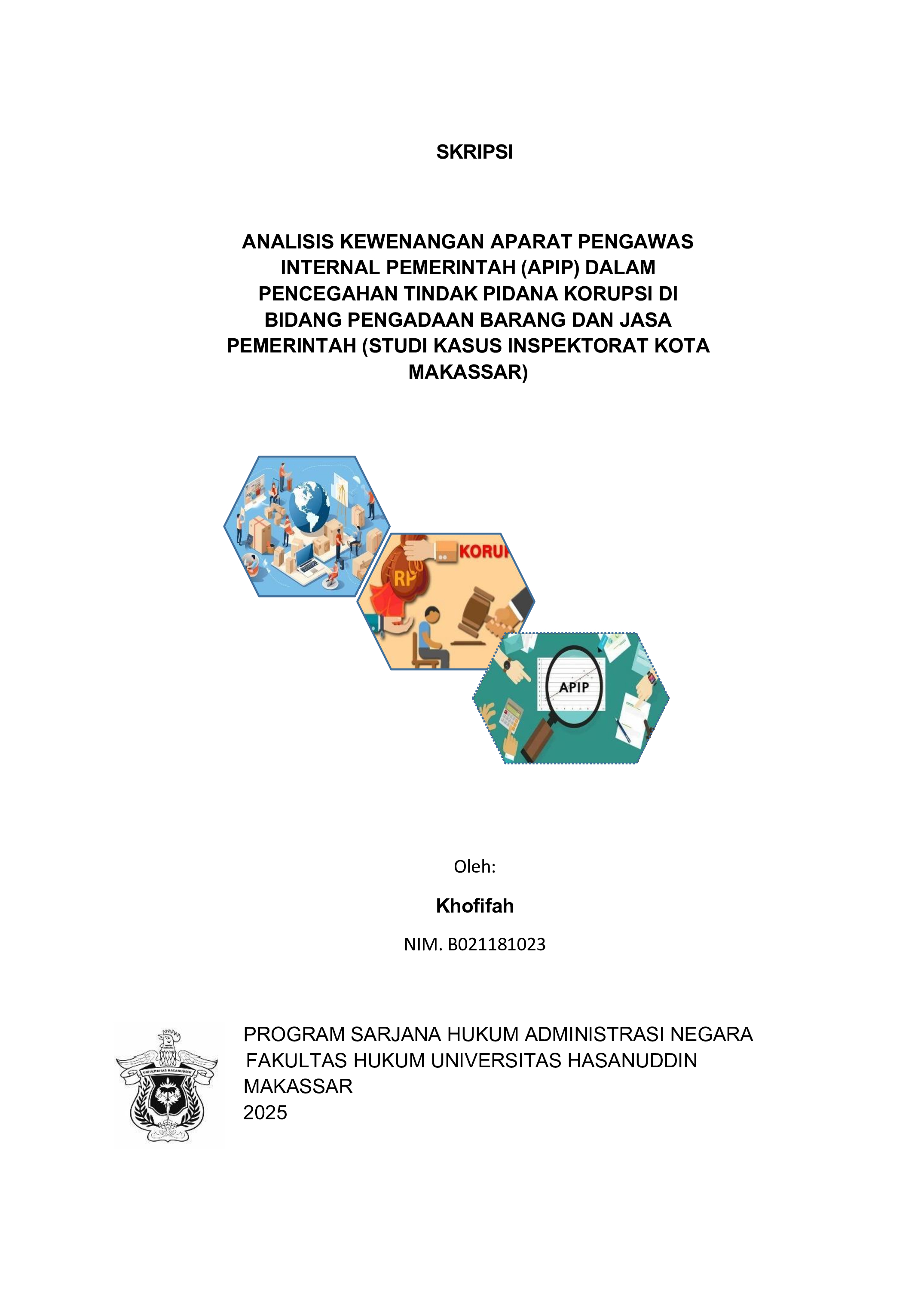 KHOFIFAH, KHOFIFAH (2025) ” Analisis Kewenangan Aparat Pengawas Internal Pemerintah (APIP) Dalam Pencegahan Tindak Pidana Korupsi Di Bidang Pengadaan Barang dan Jasa Pemerintah (Studi Kasus Inspektorat Kota Makassar) = Analysis of the Authority of Government Internal Supervisory Apparatus (APIP) in Preventing Corruption in Government Procurement of Goods and Services (Case Study of the Makassar City Inspectorate). Skripsi thesis, Universitas Hasanuddin.