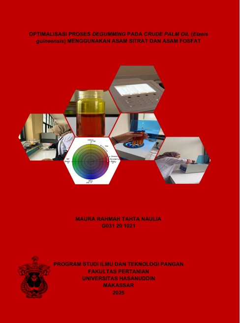 NAULIA, MAURA RAHMAH TAHTA (2025) Optimalisasi Proses Degumming pada Crude Palm Oil (Elais Guinensiss) menggunakan asam sitrat dan asam fosfat = OPTIMIZATION OF DEGUMMING PROCESS ON CRUDE PALM OIL (Elaeis Guineensis) USING CITRIC ACID AND PHOSPHORIC ACID. Skripsi thesis, Universitas Hasanuddin.