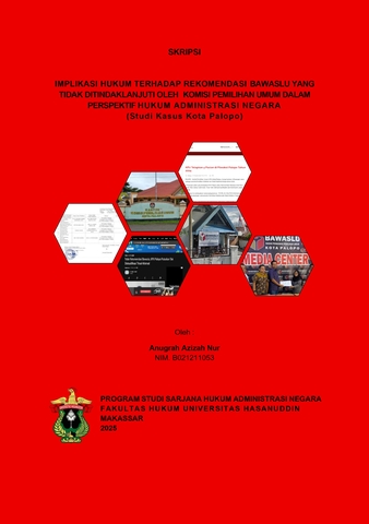 ABSTRAK ANUGRAH AZIZAH NUR (B021211053). Implikasi Hukum Terhadap Rekomendasi Bawaslu Yang Tidak Di Tindaklanjuti Oleh Komisi Pemilihan Umum Dalam Perspektif Hukum Administrasi Negara (Studi Kasus Kota Palopo). Dibimbing oleh Fajlurrahman Jurdi sebagai Pembimbing. Penelitian ini bertujuan untuk mengetahui dua hal. Pertama, kewenangan Komisi Pemilihan Umum (KPU) dalam menindaklanjuti Rekomendasi Bawaslu ditinjau dari Undang-Undang Nomor 10 Tahun 2016. Kedua, penelitian ini bertujuan untuk mengetahui akibat hukum terhadap rekomendasi Badan Pengawas Pemilu yang tidak ditindaklanjuti oleh Komisi Pemilihan Umum. Penelitian ini menggunakan tipe penelitian hukum normatif, kemudian dalam penelitian ini digunakan beberapa pendekatan yang diantaranya: pendekatan perundang-undangan dan pendekatan kasus. Bahan hukum yang dikumpulkan yakni berupa peraturan perundang-undangan terkait penelitian ini serta buku-buku teks, jurnal hukum serta pandangan ahli yang kemudian dianalisis sesuai dengan persoalan yang diteliti. Hasil yang diperoleh dalam penelitian ini, yaitu: 1) Kewenangan Komisi Pemilihan Umum (KPU) dalam menindaklanjuti rekomendasi Badan Pengawas Pemilu (Bawaslu) berdasarkan Undang-Undang Nomor 10 Tahun 2016 tentang Pemilihan Kepala Daerah. Dalam ketentuan tersebut ditegaskan bahwa tindaklanjut rekomendasi Bawaslu bersifat wajib. Dan KPU memiliki kewenangan untuk mengatur ketentuan lebih lanjut pada PKPU nomor 15 Tahun 2024 utamanya dalam hal tindaklanjut rekomendasi; 2) Akibat hukum dari tidak ditindaklanjutinya rekomendasi Badan Pengawas Pemilu (Bawaslu) oleh Komisi Pemilihan Umum (KPU) mengakibatkan timbulnya ketidakpastian hukum pada Keputusan yang dikeluarkan KPU yang tanpa memperhatikan rekomendasi tersebut secara substansif. Bentuk tidak ditindaklanjutinya rekomendasi Bawaslu dapat berdampak kepada sengketa hasil pemilihan suara, serta proses sidang pelanggaran kode etik. Kata Kunci: Rekomendasi Bawaslu, Kewenangan KPU, Pilkada
