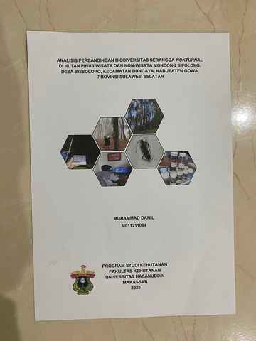 DANIL, MUHAMMAD (2025) Analisis Perbandingan Biodiversitas Serangga Nokturnal Di Hutan Pinus Wisata Dan Non-Wisata Moncong Sipolong, Desa Bissoloro, Kecamatan Bungaya, Kabupaten Gowa, Provinsi Sulawesi Selatan = Comparative Analysis of Nocturnal Insect Biodiversity in Moncong Sipolong Tourist and Non-Tourist Pine Forest, Bissoloro Village, Bungaya District, Gowa Regency, South Sulawesi Province. Skripsi thesis, UNIVERSITAS HASANUDDIN MAKASSAR.