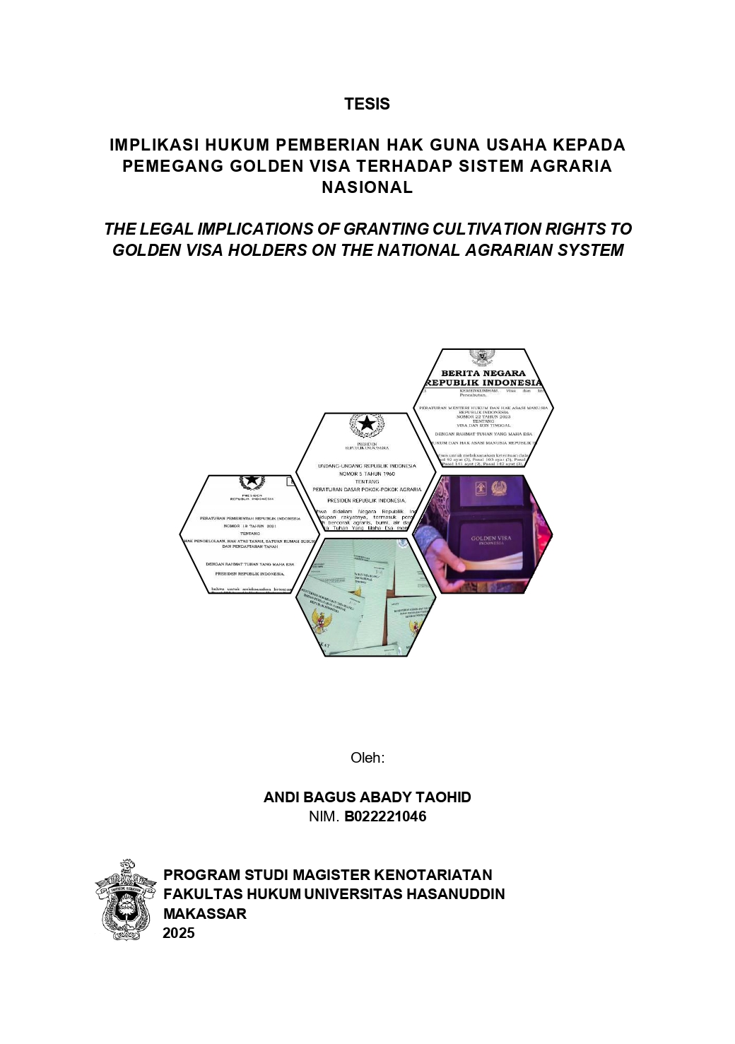 TAOHID, ANDI BAGUS ABADY (2025) IMPLIKASI HUKUM PEMBERIAN HAK GUNA USAHA KEPADA PEMEGANG GOLDEN VISA TERHADAP SISTEM AGRARIA NASIONAL = THE LEGAL IMPLICATIONS OF GRANTING CULTIVATION RIGHTS TO GOLDEN VISA HOLDERS ON THE NATIONAL AGRARIAN SYSTEM. Thesis thesis, Universitas Hasanuddin.