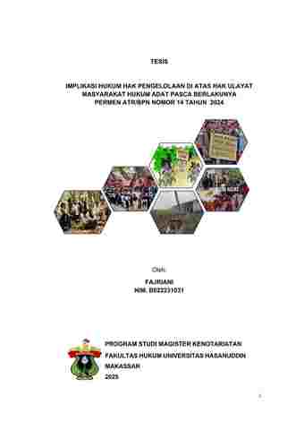 FAJRIANI (B022231031). Implikasi Hukum Hak Pengelolaan Di Atas Hak Ulayat Masyarakat Hukum Adat Pasca Berlakunya Permen ATR/BPN Nomor 14 Tahun 2024. Di bawah bimbingan Muhammad Aswan Penelitian ini bertujuan untuk menganalisis apakah hak pengelolaan di atas hak ulayat sesuai dengan konsepsi hukum pertanahan nasional dan bagaimana pengaturan hak pengelolaan di atas hak ulayat terhadap eksistensi masyarakat hukum adat. Penelitian ini adalah penelitian hukum normatif yaitu penelitian hukum yang dilakukan dengan cara meneliti bahan pustaka. Jenis dan sumber bahan hukum yaitu bahan hukum primer dan bahan hukum sekunder. Teknik pengumpulan bahan hukum adalah dengan studi pustaka. Analisis bahan hukum dilakukan secara kualitatif untuk menemukan jawaban atas permasalahan isu hukum yang sedang diteliti. Hasil penelitian menemukan bahwa hak pengelolaan di atas hak ulayat tidak disebutkan secara rinci dalam hukum pertanahan. Jika merujuk pada definisi hak pengelolaan itu sendiri adalah hak menguasai negara, maka dalam sistem hak-hak penguasaan atas tanah dalam hukum tanah nasional yang pertama adalah hak bangsa Indonesia atas tanah sebagai hak penguasaan tertinggi yang beraspek hukum perdata dan publik, hak menguasai dari negara bersumber dari hak bangsa dan beraspek hukum publik saja, dan hak-hak penguasaan individual. Sehingga, negara sebagai organisasi tertinggi memiliki kewenangan untuk mengatur sebab hak ulayat juga beraspek hukum privat dan publik. Berkaitan dengan eksistensi masyarakat hukum adat dalam pemberian hak pengeloaan di atas hak ulayat perlindungan terhadap hak-hak masyarakat hukum adat dilakukan sepanjang adanya pengakuan dari pemerintah di setiap wilayah dan eksistensi masyarakat akan tetap hidup apabila dikerjasamakan dengan pihak ketiga sebab dalam perjanjian kerjasama tersebut tetap memastikan adanya persetujuan dan keterlibatan dari masyarakat adat yang ada di wilayah tersebut