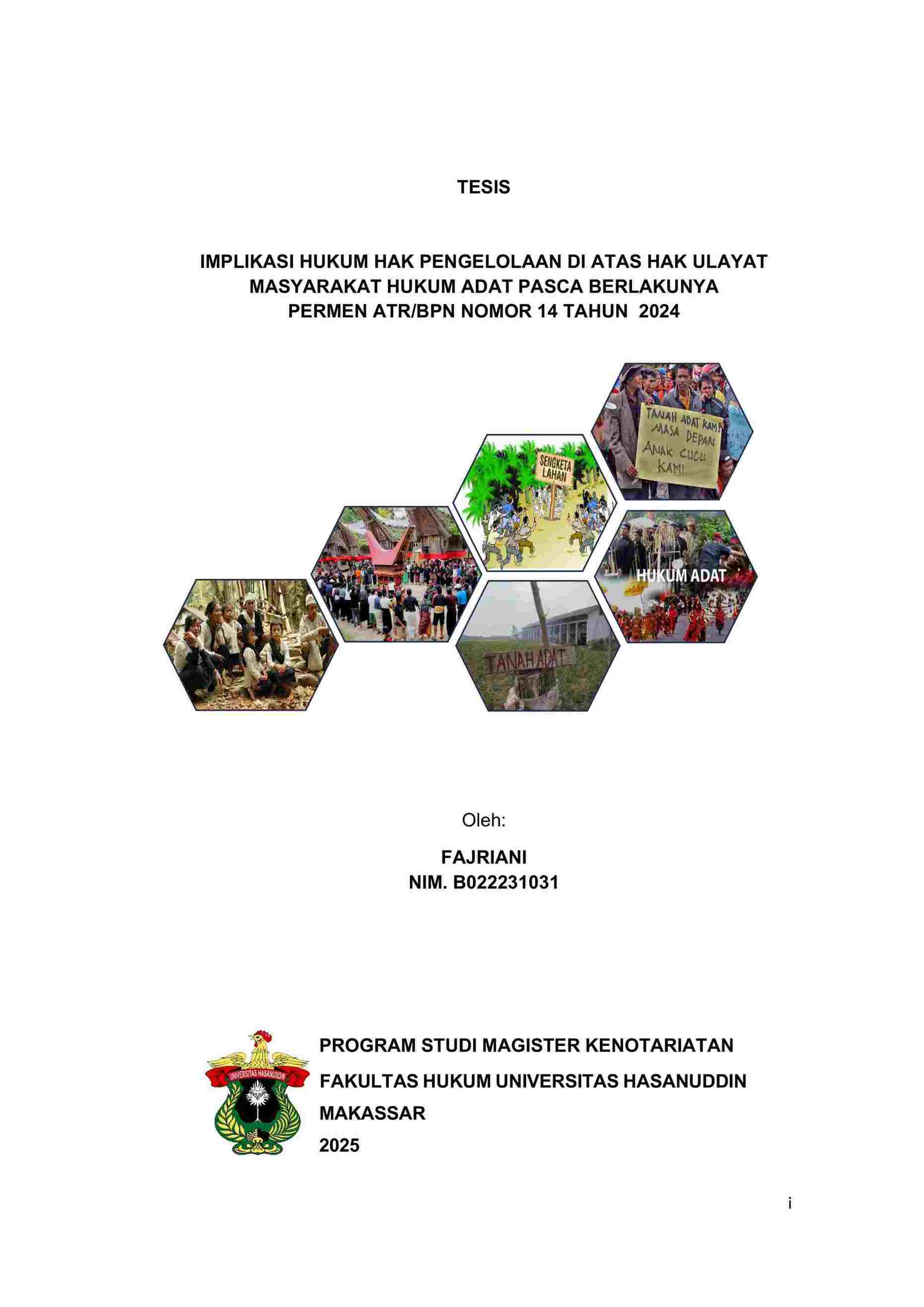 FAJRIANI, FAJRIANI (2025) IMPLIKASI HUKUM HAK PENGELOLAAN DI ATAS HAK ULAYAT MASYARAKAT HUKUM ADAT PASCA BERLAKUNYA PERMEN ATR/BPN NOMOR 14 TAHUN 2024 = LEGAL IMPLICATIONS OF MANAGEMENT RIGHTS ABOVE THE CUSTOMARY RIGHTS OF CUSTOMARY COMMUNITIES AFTER THE EFFECTIVENESS OF MINISTERIAL REGULATION OF ATR/BPN NUMBER 14 OF 2024. Thesis thesis, Universitas Hasanuddin.