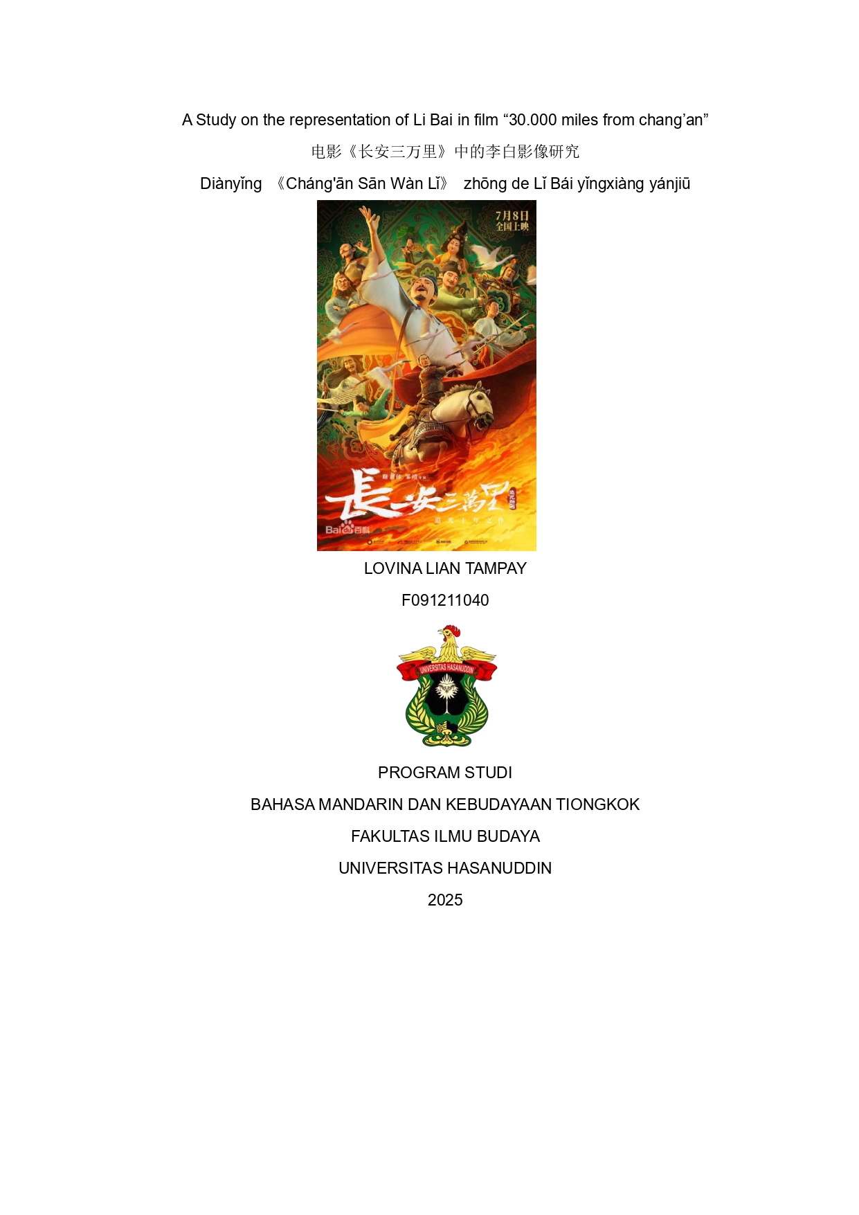TAMPAY, LOVINA LIAN (2025) Analisis Representasi Li Bai dalam Film "30.000 Miles from Chang'an" = A Study on the representation of Li Bai in film "30.000 miles from chang’an". Skripsi thesis, Universitas Hasanuddin.