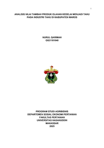 QARIMAH, NURUL (2025) ANALISIS NILAI TAMBAH PRODUK OLAHAN KEDELAI MENJADI TAHU PADA INDUSTRI TAHU DI KABUPATEN MAROS = Analysis Of Added Value Of Processed Soybean Products Info Tofu In The Tofu Industry In Maros Regency. Skripsi thesis, Universitas Hasanuddin.
