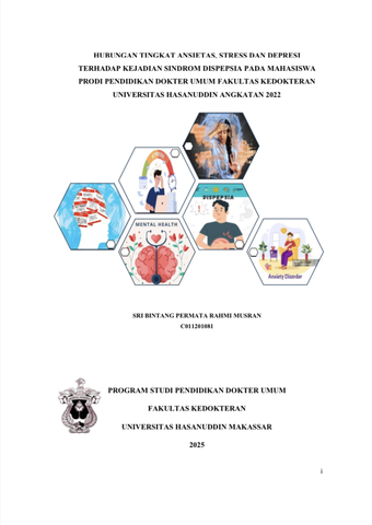 MUSRAN, SRI BINTANG PERMATA RAHMI (2025) HUBUNGAN TINGKAT ANSIETAS, STRESS DAN DEPRESI TERHADAP KEJADIAN SINDROM DISPEPSIA PADA MAHASISWA PRODI PENDIDIKAN DOKTER UMUM FAKULTAS KEDOKTERAN UNIVERSITAS HASANUDDIN ANGKATAN 2022 = RELATIONSHIP BETWEEN ANXIETY, STRESS AND DEPRESSION LEVELS AND THE INCIDENCE OF DYSPEPSIA SYNDROME IN STUDENTS OF THE GENERAL MEDICINE EDUCATION STUDY PROGRAM, FACULTY OF MEDICINE, HASANUDDIN UNIVERSITY, CLASS 2022. Skripsi thesis, Universitas Hasanuddin.
