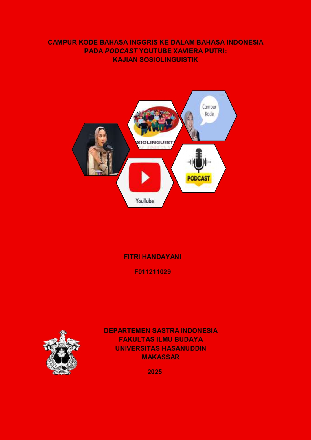 HANDAYANI, FITRI (2025) Campur Kode Bahasa Inggris ke dalam Bahasa Indonesia pada Podcast YouTube Xaviera Putri: Kajian Sosiolinguistik = Mixing English Code into Indonesian in Xaviera Putri's YouTube Podcast: A Sociolinguistic Study. Skripsi thesis, Universitas Hasanuddin.