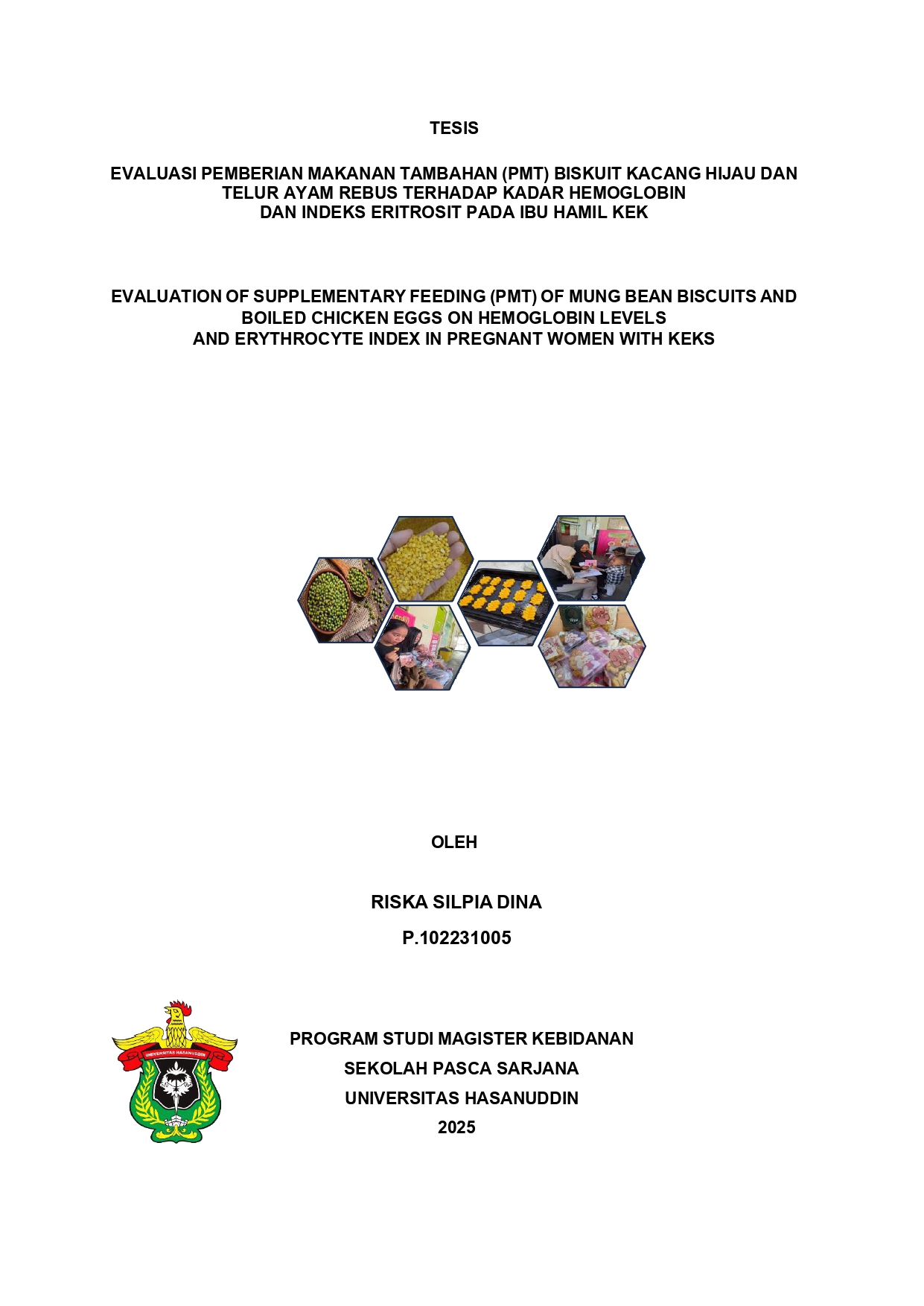 DINA, RISKA SILPIA (2025) EVALUASI PEMBERIAN MAKANAN TAMBAHAN (PMT) BISKUIT KACANG HIJAU DAN TELUR AYAM REBUS TERHADAP KADAR HEMOGLOBIN DAN INDEKS ERITROSIT PADA IBU HAMIL KEK = EVALUATION OF SUPPLEMENTARY FEEDING (PMT) OF MUNG BEAN BISCUITS AND BOILED CHICKEN EGGS ON HEMOGLOBIN LEVELS AND ERYTHROCYTE INDEX IN PREGNANT WOMEN WITH CED. Thesis thesis, Universitas Hasanuddin.