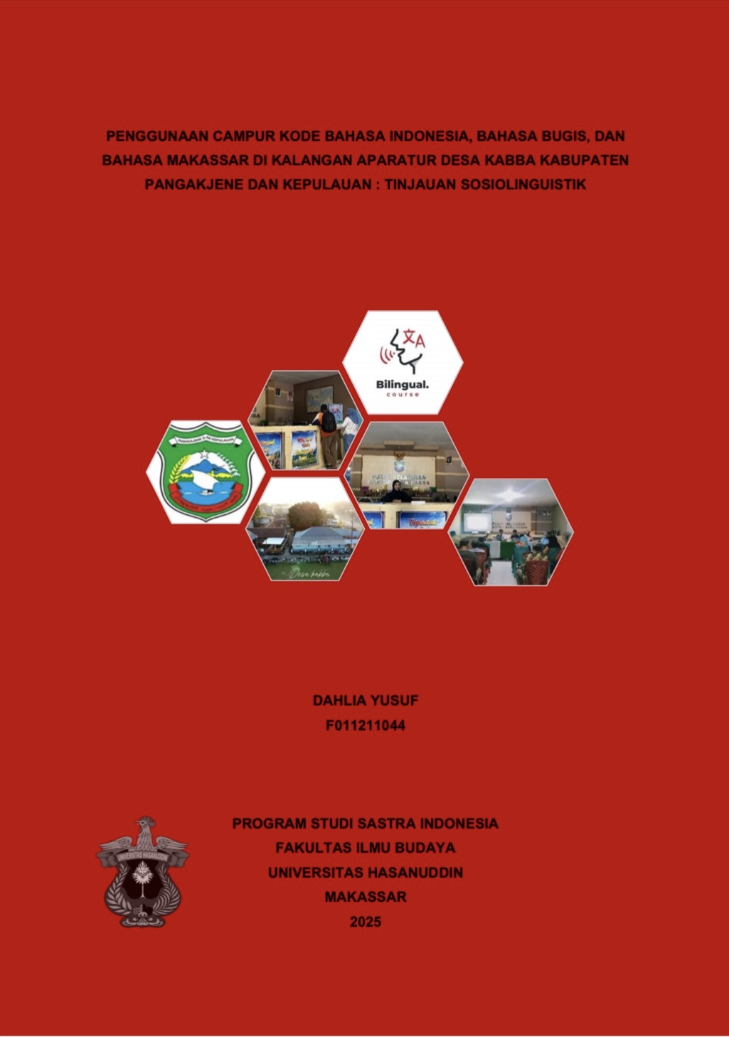 DAHLIA YUSUF. F011211044. Penggunaan Penggunaan Campur Kode Bahasa Indonesia, Bahasa Bugis, dan Bahasa Makassar di Kalangan Aparatur Desa Kabba Kabupaten Pangkajene Dan Kepulauan: Tinjauan Sosiolinguistik (dibimbing oleh Kaharuddin) Penelitian ini bertujuan mendeskripsikan bentuk-bentuk campur kode serta faktor-faktor yang menyebabkan terjadinya campur kode dalam tuturan aparatur Desa Kabba, Kecamatan Minasatene, Kabupaten Pangkajene dan Kepulauan. Penelitian ini menggunakan pendekatan sosiolinguistik dengan metode deskriptif kualitatif. Fokus penelitian diarahkan pada penggunaan bahasa Indonesia yang bercampur dengan bahasa daerah, khususnya Bugis dan Makassar dalam interaksi formal maupun informal di lingkungan kerja aparatur Desa Kabba, Kec. Minasatene, Kab. Pangkajene dan Kepulauan. Sumber data diperoleh dari tuturan lisan aparatur desa yang mengandung unsur campur kode. Teknik pengumpulan data yang digunakan adalah metode simak, rekam, dan catat, sedangkan teknik analisis data menggunakan model analisis interaktif. Hasil penelitian menunjukkan bahwa bentuk campur kode yang ditemukan meliputi campur kode dalam bentuk kata, frasa, dan klausa. Adapun faktor-faktor yang memengaruhi terjadinya campur kode meliputi identifikasi terhadap ragam bahasa, identitas peran sosial penutur, serta keinginan untuk menjelaskan atau menafsirkan informasi. Hasil penelitian ini menunjukkan bahwa campur kode tidak hanya mencerminkan kebiasaan linguistik, tetapi juga merupakan bagian dari strategi komunikasi sosial yang mencerminkan kedekatan budaya dan efektivitas penyampaian informasi dalam pelayanan publik tingkat desa.