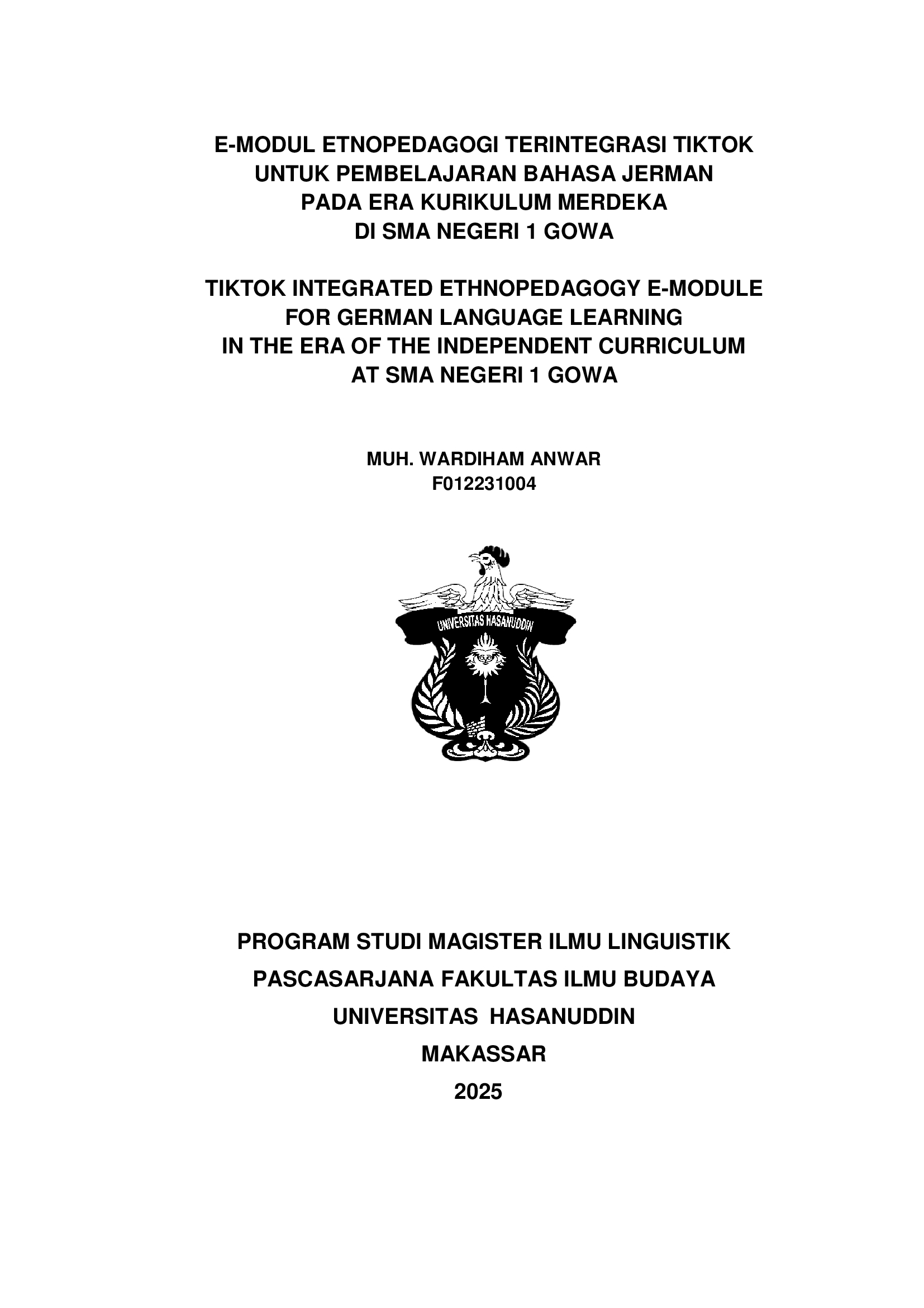 ANWAR, MUH. WARDIHAM (2025) E-MODUL ETNOPEDAGOGI TERINTEGRASI TIKTOK UNTUK PEMBELAJARAN BAHASA JERMAN PADA ERA KURIKULUM MERDEKA DI SMA NEGERI 1 GOWA = TIKTOK INTEGRATED ETHNOPEDAGOGY E-MODULE FOR GERMAN LANGUAGE LEARNING IN THE ERA OF THE INDEPENDENT CURRICULUM AT SMA NEGERI 1 GOWA. Thesis thesis, Universitas Hasanuddin.