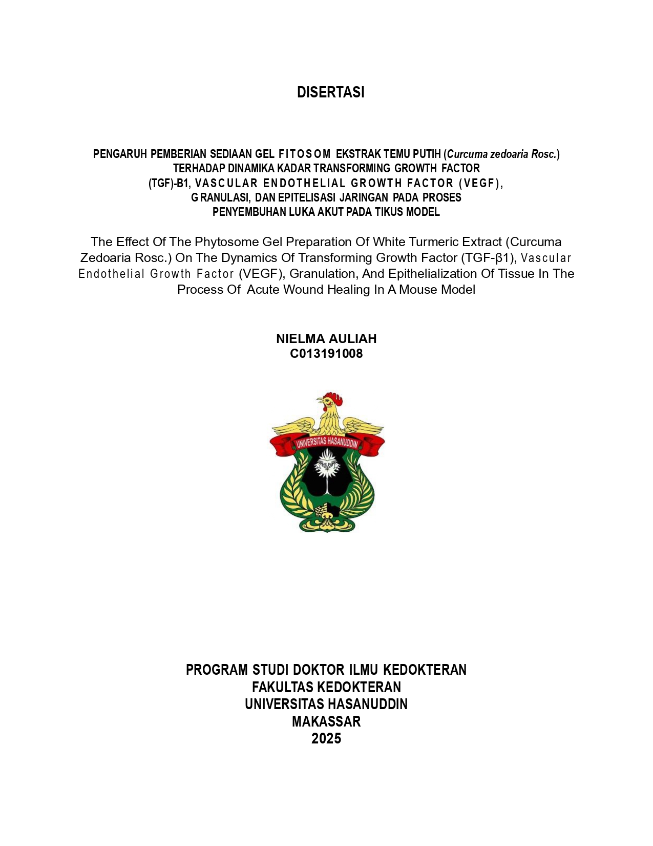 Auliah, Nielma (2025) Pengaruh Pemberian Sediaan Gel Fitosom Ekstrak Temu Putih (Curcuma zedoaria Rosc.) terhadap Dinamika Kadar Transforming Growth Factor (TGF β1), VEGF, Granulasi, dan Epitelisasi Jaringan pada Proses Penyembuhan Luka Akut pada Tikus Model = The Effect Of The Phytosome Gel Preparation Of White Turmeric Extract (Curcuma Zedoaria Rosc.) On The Dynamics Of Transforming Growth Factor (TGF-β1), Vascular Endothelial Growth Factor (VEGF), Granulation, And Epithelialization Of Tissue In The Process Of Acute Wound Healing In A Mouse Model. Disertasi thesis, Universitas Hasanuddin.