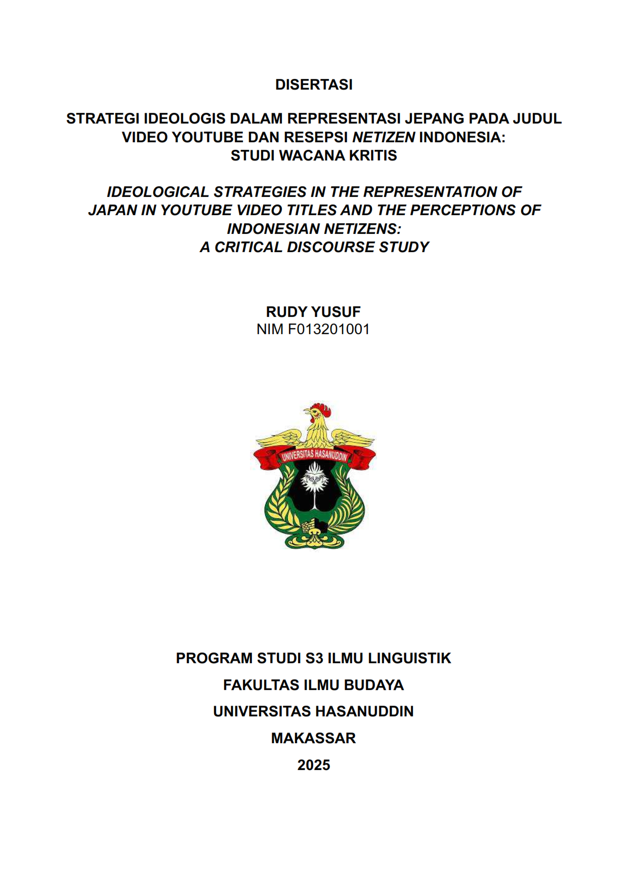 Rudy Yusuf. 2025. Strategi Ideologis dalam Representasi Jepang pada Judul Video YouTube dan Resepsi Netizen Indonesia: Studi Wacana Kritis (dibimbing oleh Muhammad Darwis, Ikhwan M. Said dan Andi Faisal). Tujuan penelitian yaitu menguraikan representasi “Jepang” yang dikonstruksi dan dioperasikan sebagai instrumen ideologis dalam ruang digital Indonesia, serta bagaimana posisi ideologis netizen Indonesia dipetakan melalui respons mereka di platform YouTube. Dengan menggunakan pendekatan linguistik terapan, penelitian ini menjawab dua rumusan masalah utama: (1) bagaimana representasi Jepang dibentuk dalam judul video sebagai sarana produksi makna, afeksi, dan relasi kuasa antara kreator dan netizen; dan (2) bagaimana posisi ideologis netizen Indonesia dapat dikenali melalui analisis komentar-komentar yang muncul. Penelitian ini menggunakan kerangka Analisis Wacana Kritis (Van Dijk), teori interpelasi ideologis (Althusser), dan ekonomi politik media (Mosco), dengan data berupa judul dan komentar video dari dua channel YouTube populer: Genki Banget dan Neo Japan. Penelitian ini merupakan studi deskriptif kualitatif dengan menggunakan observasi daring, dokumentasi data, dan pengambilan sampel purposive dengan tangkap layar dan catat. Hasil analisis menunjukkan bahwa judul-judul video bekerja secara strategis dalam memanggil netizen ke dalam posisi ideologis tertentu melalui pemilihan kata, struktur kalimat, dan afeksi. Representasi Jepang dikonstruksi sebagai entitas yang akrab, unggul, dan aspiratif, memperkuat citra positif yang mendukung dominasi simbolik dan relasi kuasa pascakolonial. Terdapat perbedaan dan persamaan dalam strategi kedua chennel. Genki Banget lebih menekankan pendekatan humoris dan interkultural dengan menampilkan orang Jepang yang belajar budaya Indonesia, sehingga netizen diposisikan sebagai penilai atau pemilik budaya lokal. Sebaliknya, Neo Japan membangun narasi emosional dan domestik seperti kisah keluarga dan perjuangan hidup di Jepang, yang mendorong penonton mengidentifikasi diri dalam mimpi bekerja atau berkeluarga di Jepang. Keduanya sama-sama menggunakan strategi afektif dan narasi positif tentang Jepang, namun berbeda dalam orientasi pemanggilan subjektivitas: satu berbasis pengamatan, satu berbasis aspirasi. Analisis komentar netizen memperlihatkan bahwa mayoritas penonton menempati posisi hegemonik dan negosiasi, dengan sebagian kecil menunjukkan resistensi. Ini menandakan bahwa representasi ideologis tentang Jepang dalam konten video tidak hanya diterima, tetapi juga diinternalisasi dan disesuaikan oleh netizen Indonesia. Afeksi menjadi medium utama dalam menyamarkan ideologi, sementara algoritma YouTube berperan sebagai aparatus distribusi dan monetisasi ideologis.