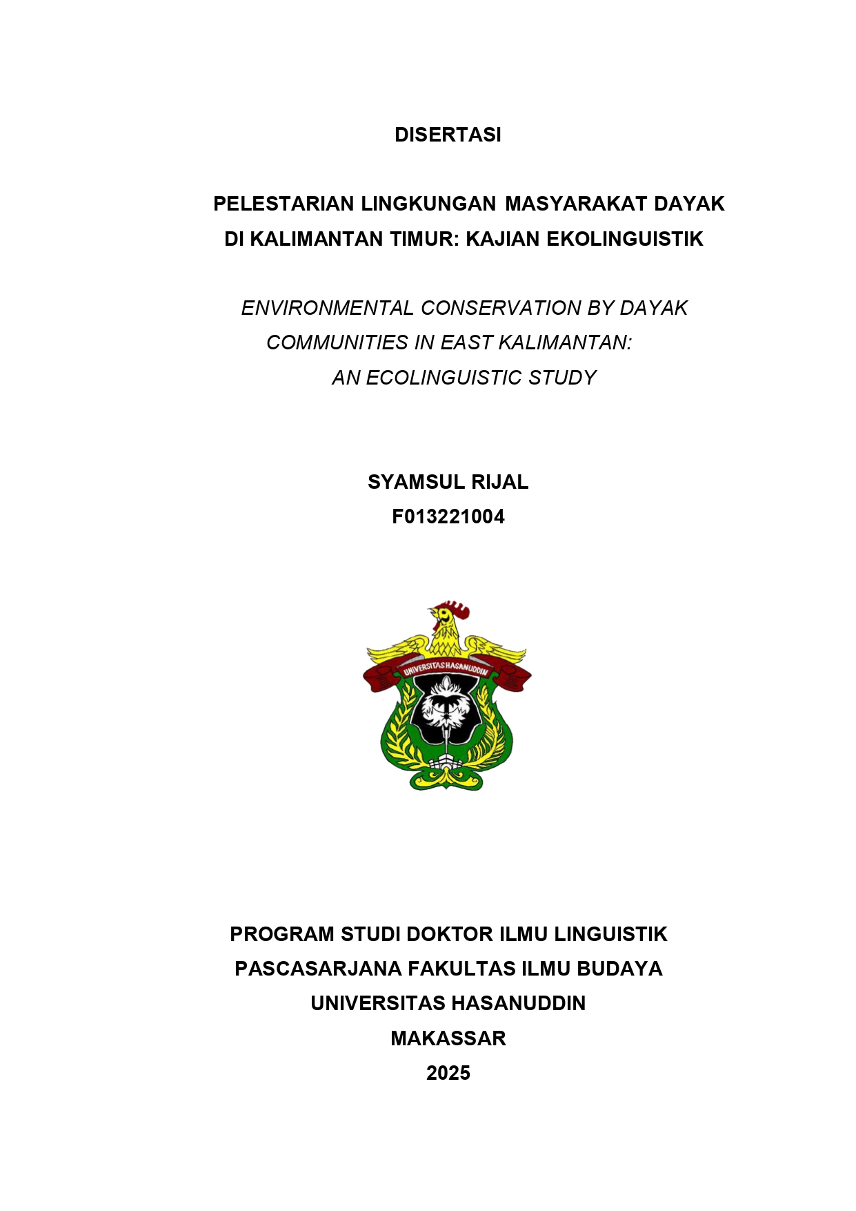 RIJAL, SYAMSUL (2025) PELESTARIAN LINGKUNGAN MASYARAKAT DAYAK DI KALIMANTAN TIMUR: KAJIAN EKOLINGUISTIK = ENVIRONMENTAL CONSERVATION BY DAYAK COMMUNITIES IN EAST KALIMANTAN: AN ECOLINGUISTIC STUDY. Disertasi thesis, Universitas Hasanuddin.