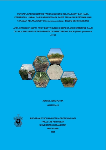 ADHE PUTRA, AZWAN (2025) PENGAPLIKASIAN KOMPOS TANDAN KOSONG KELAPA SAWIT DAN HASIL FERMENTASI LIMBAH CAIR PABRIK KELAPA SAWIT TERHADAP PERTUMBUHAN TANAMAN KELAPA SAWIT (Elaeis guineensis Jacq.) BELUM MENGHASILKAN = APPLICATION OF EMPTY FRUIT EMPTY BUNCH COMPOST AND FERMENTED PALM OIL MILL EFFLUENT ON THE GROWTH OF IMMATURE OIL PALM (Elaeis guineensis Jacq.). Thesis thesis, UNIVERSITAS HASANUDDIN MAKASSAR.